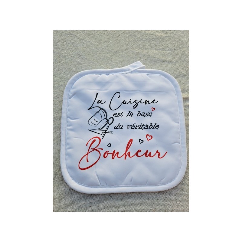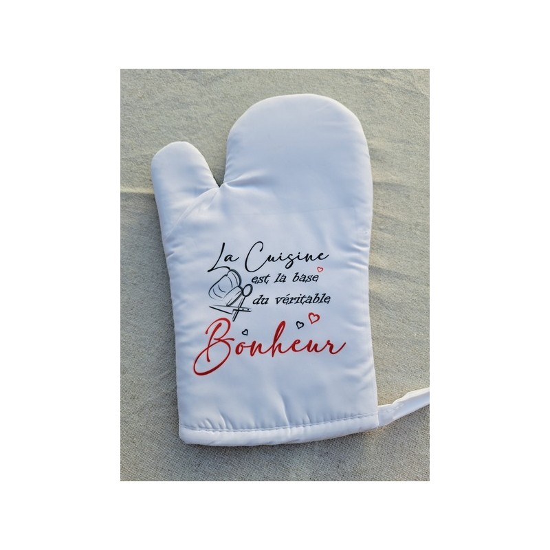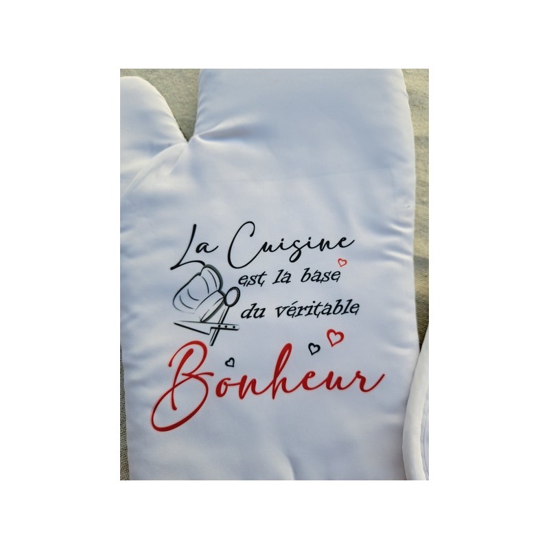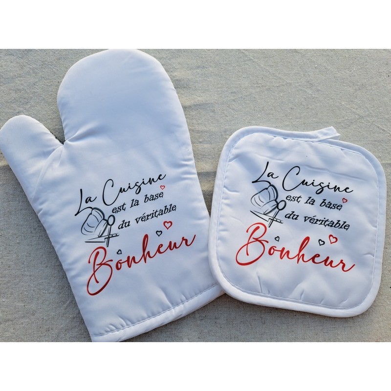 Transformez votre cuisine en un lieu de joie et de partage avec ce lot de gant et manique personnalisés. L’inscription inspirante "La cuisine est la base du véritable bonheur" apportera une touche chaleureuse et motivante à votre quotidien.