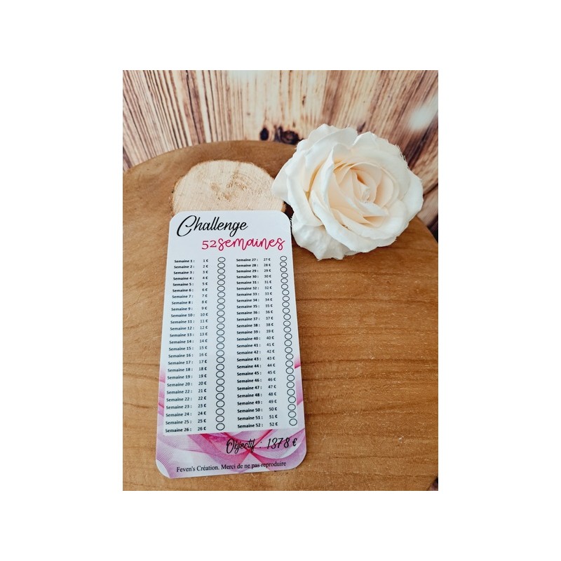 Ce challenge permettra d’économiser 1378€ sur 52 semaines. Vous pouvez suivre semaine par semaine le montant indiqué ou cocher chaque semaine le montant que vous souhaitez économiser. L’objectif est d’avoir cocher toutes les cases à la fin de l’année pour pouvoir économiser les 1378€.