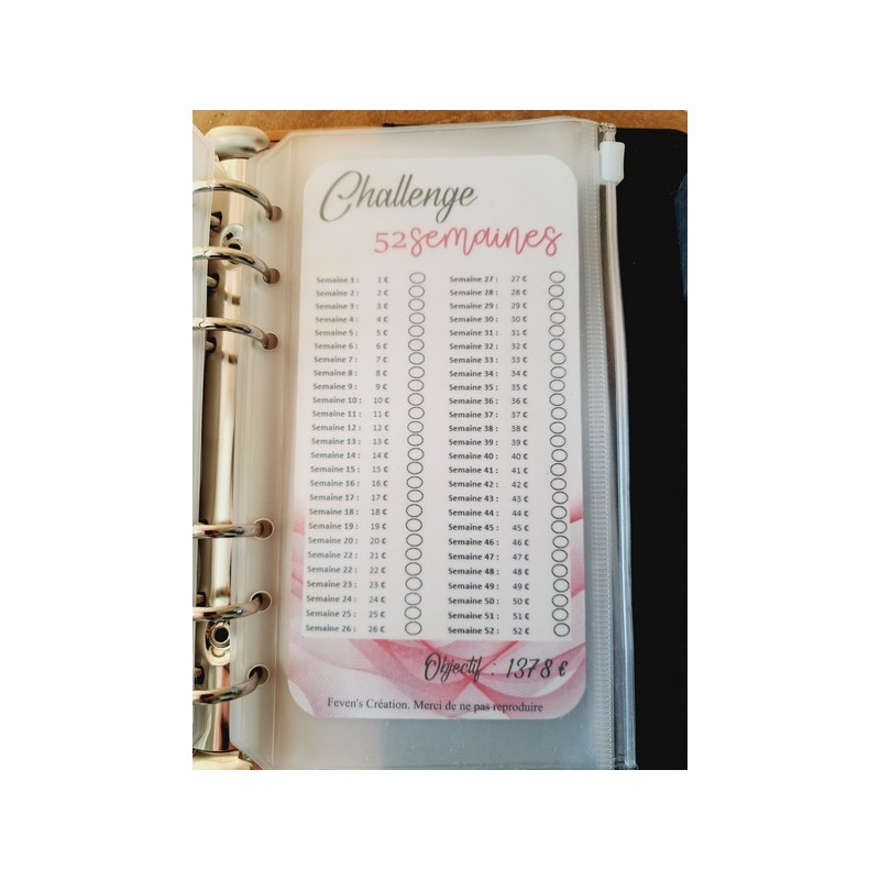 Fiche plastifiée mini défi/challenge pour enveloppe budgétaire. Pour écrire, le mieux est d'utiliser un marqueur effaçable afin de pouvoir réutiliser cette fiche une fois le défi terminé.