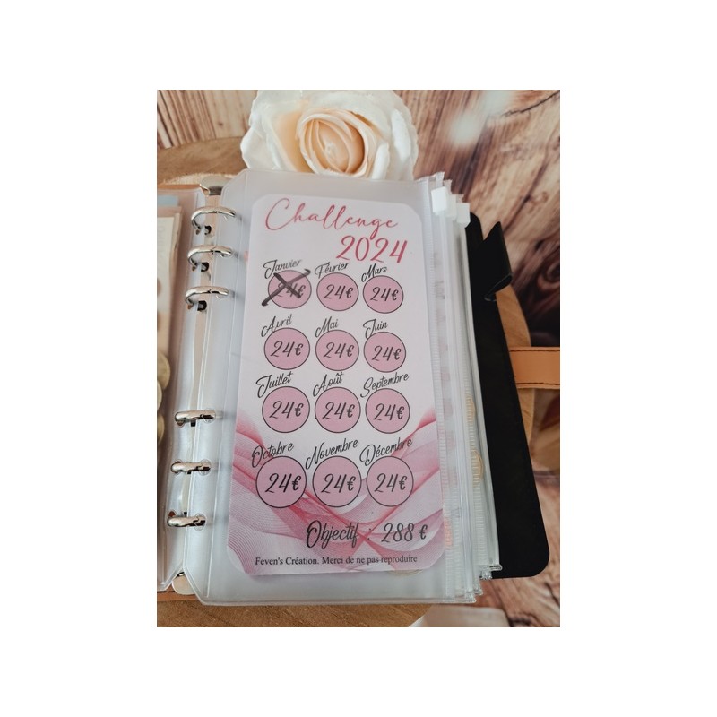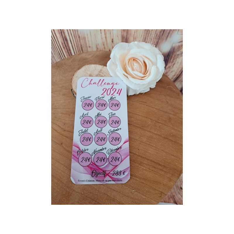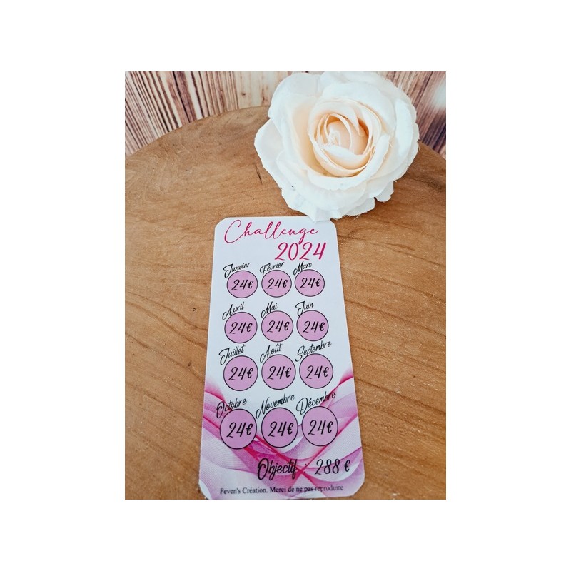 Fiche plastifiée mini défi/challenge pour enveloppe budgétaire. Pour écrire, le mieux est d'utiliser un marqueur effaçable afin de pouvoir réutiliser cette fiche une fois le défi terminé.