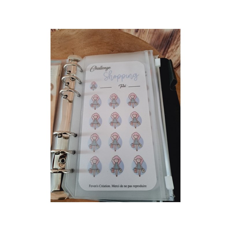 Fiche plastifiée mini défi/challenge pour enveloppe budgétaire. Pour écrire, le mieux est d'utiliser un marqueur effaçable afin de pouvoir réutiliser cette fiche une fois le défi terminé.