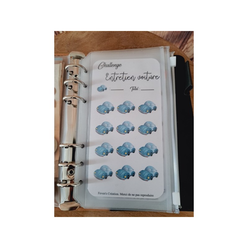Fiche plastifiée mini défi/challenge pour enveloppe budgétaire. Pour écrire, le mieux est d'utiliser un marqueur effaçable afin de pouvoir réutiliser cette fiche une fois le défi terminé.