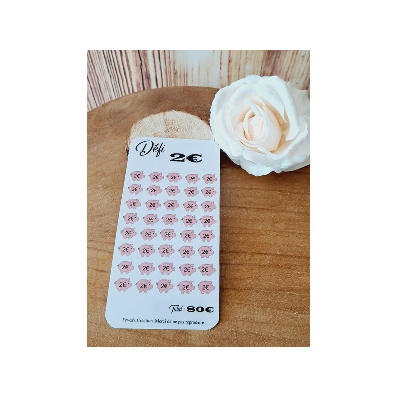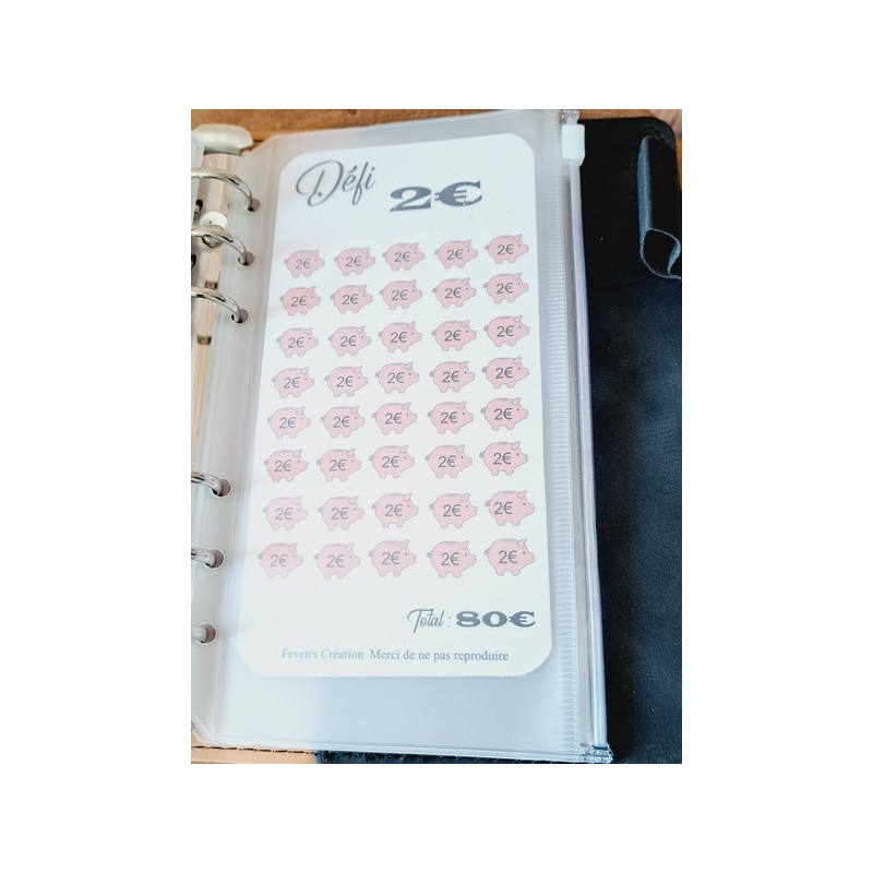 Fiche plastifiée mini défi/challenge pour enveloppe budgétaire. Pour écrire, le mieux est d'utiliser un marqueur effaçable afin de pouvoir réutiliser cette fiche une fois le défi terminé.