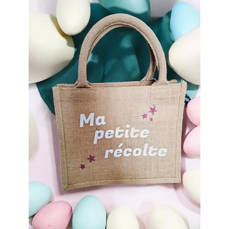 - Design unique : Une inscription élégante "Ma petite récolte", accompagnée d’un adorable lapin pailleté vu de dos. Le pompon en guise de queue ajoute une touche ludique et originale.