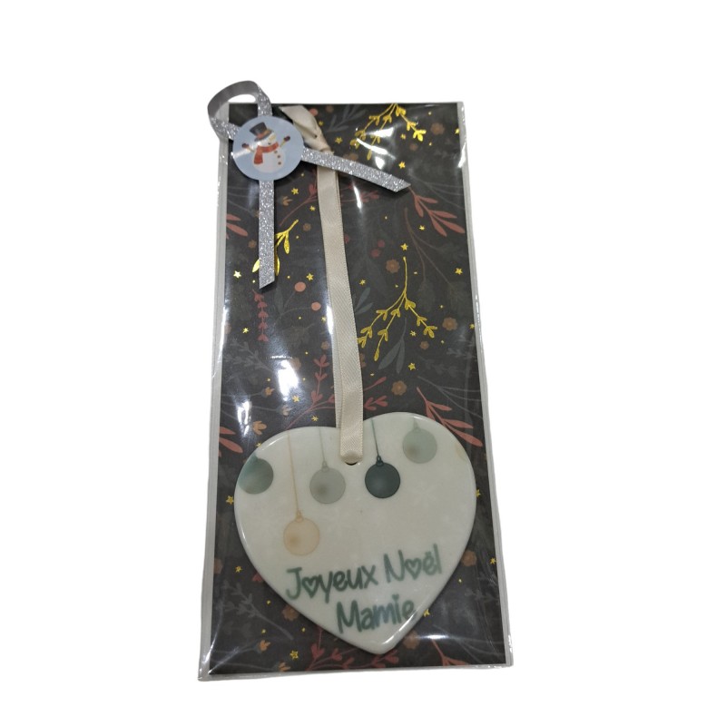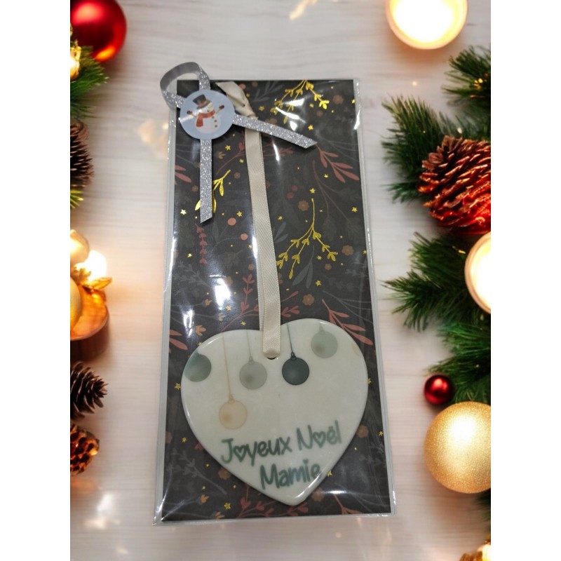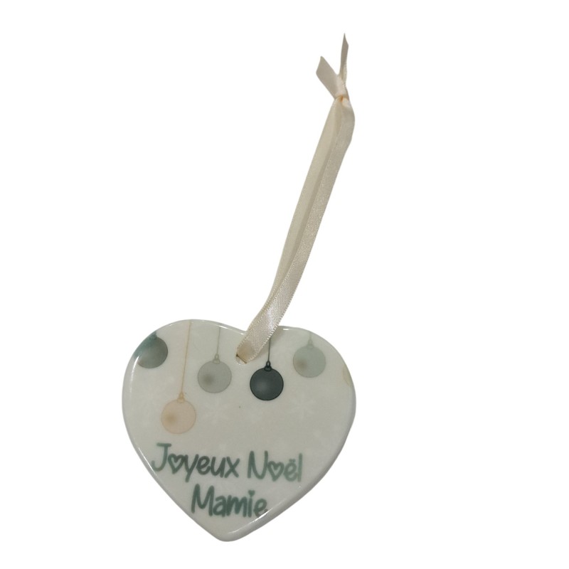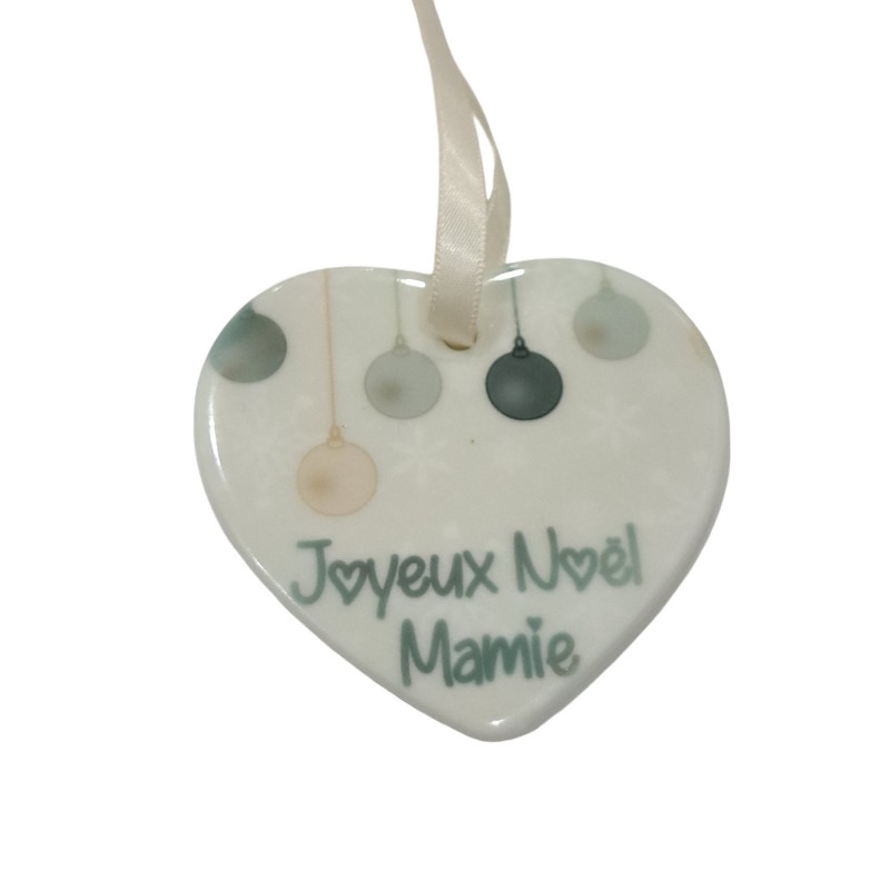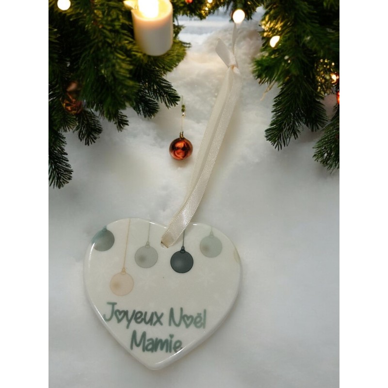 Faites briller les yeux de votre grand-mère avec notre ornement en céramique 'Joyeux Noël Mamie' en forme de cœur. Cet adorable souvenir est parfait pour montrer à votre mamie combien elle est spéciale et aimée pendant les fêtes. Suspendu au sapin, il ajoutera une touche de tendresse et de joie à vos décorations de Noël. Personnalisable avec l’année, cet ornement unique deviendra un trésor à chérir année après année.