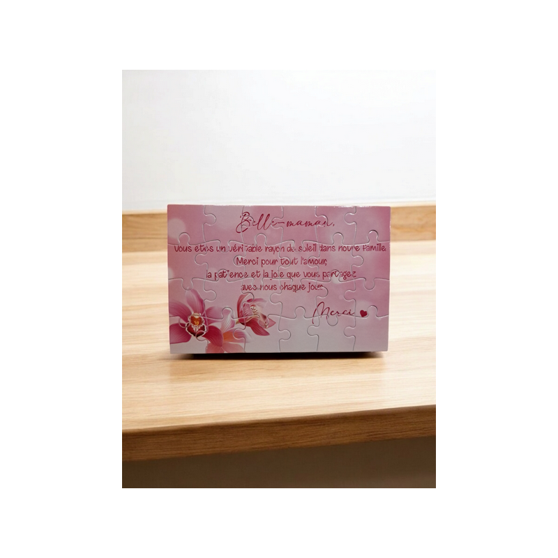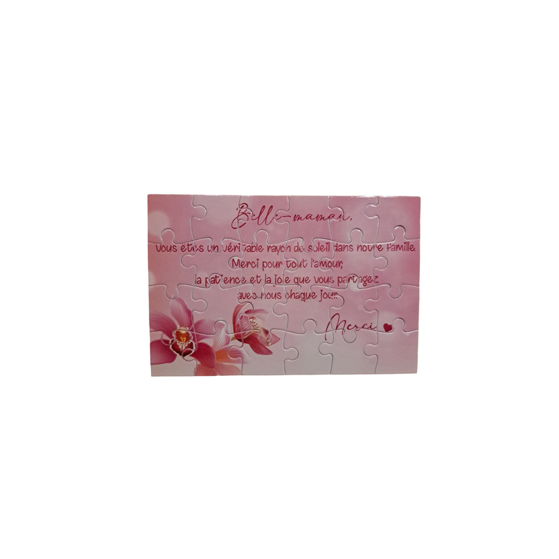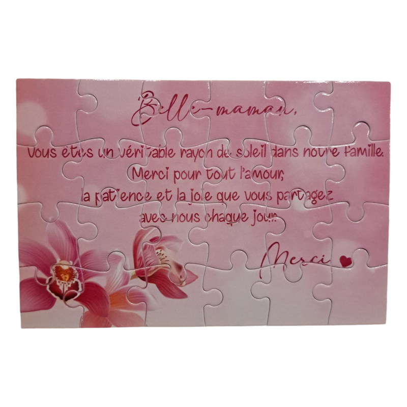 Découvrez le cadeau parfait pour Belle-maman ! Un puzzle de 24 pièces qui, une fois assemblé, révèle un joli message de tendresse. Ce puzzle personnalisé, mesurant 16,5 x 11 cm, est conçu pour créer des moments uniques et renforcer les liens familiaux. Offrez un souvenir rempli de douceur qui la touchera au cœur, accompagné d'un élégant pochon. Idéal pour toutes les occasions, ce puzzle est bien plus qu'un simple jeu : c’est un geste d’amour et de gratitude.