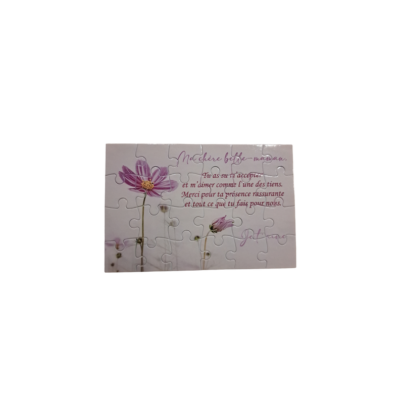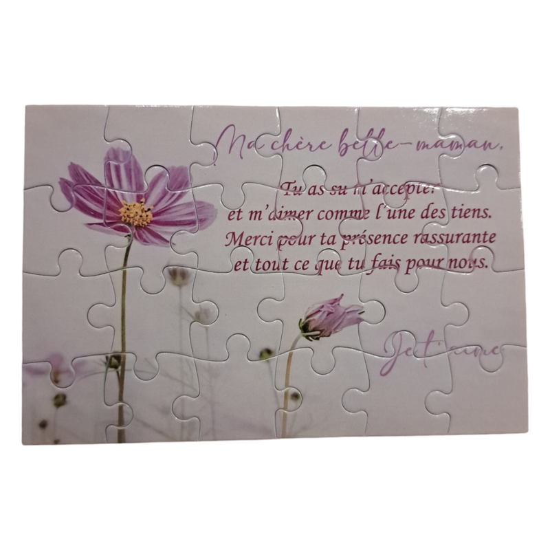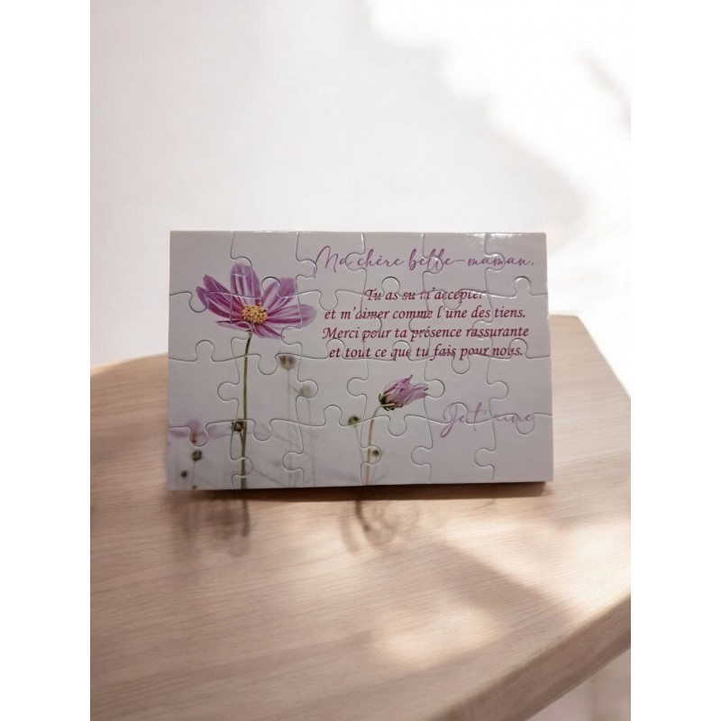 Découvrez le cadeau parfait pour Belle-maman ! Un puzzle de 24 pièces qui, une fois assemblé, révèle un joli message de tendresse. Ce puzzle personnalisé, mesurant 16,5 x 11 cm, est conçu pour créer des moments uniques et renforcer les liens familiaux. Offrez un souvenir rempli de douceur qui la touchera au cœur, accompagné d'un élégant pochon. Idéal pour toutes les occasions, ce puzzle est bien plus qu'un simple jeu : c’est un geste d’amour et de gratitude.