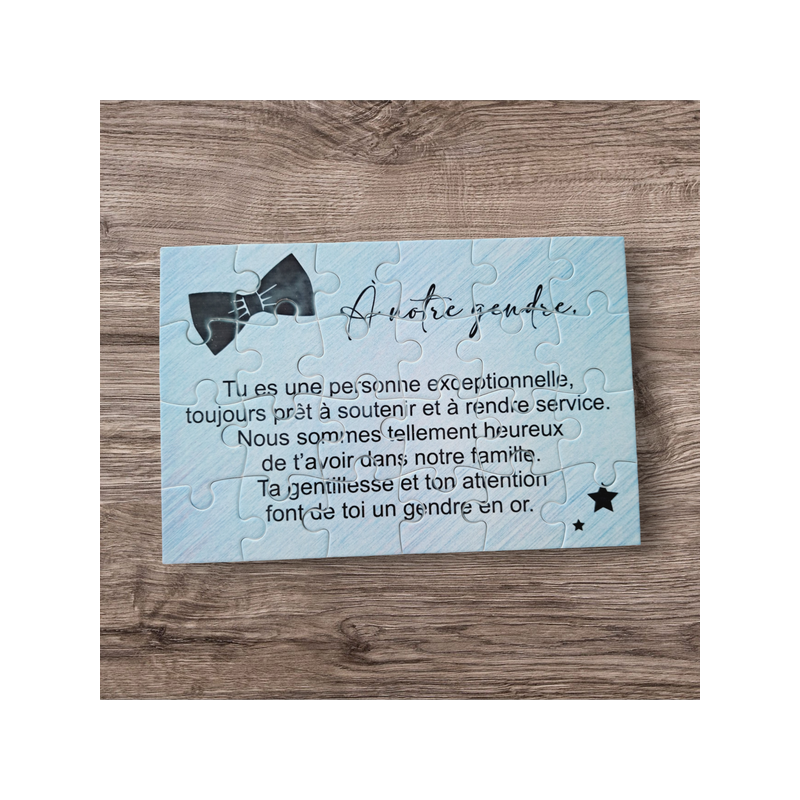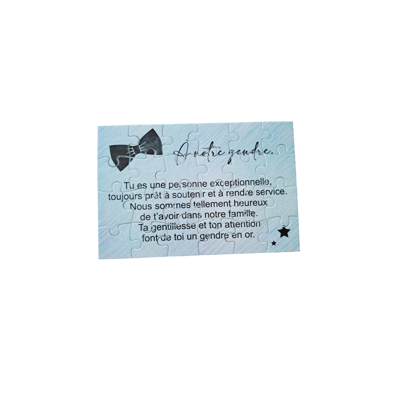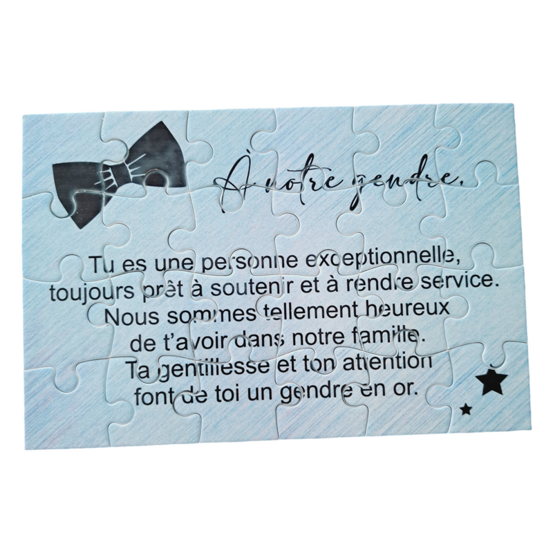 Ce puzzle personnalisé de 16,5 x 11 cm est une belle manière de montrer votre attachement pour votre gendre. Avec un joli texte qui exprime votre reconnaissance, ce cadeau est un symbole des liens familiaux et des moments partagés. Un souvenir à construire, parfait pour rappeler des sentiments sincères.