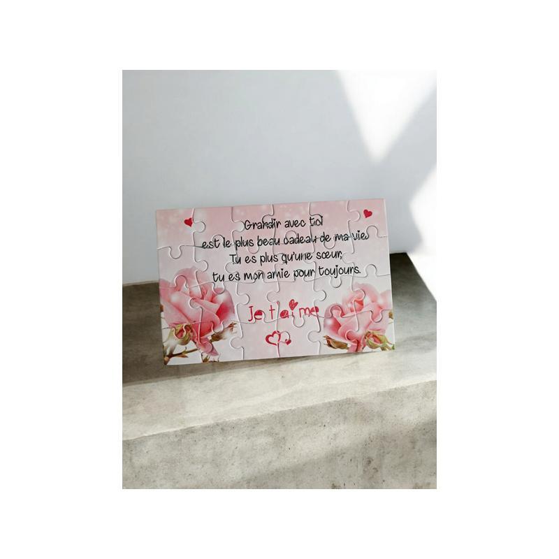 Un cadeau original et tendre pour votre sœur bien-aimée ! Ce puzzle de 24 pièces (16,5 cm x 11 cm) est une manière unique de lui dire combien elle compte pour vous. Avec un joli texte personnalisé, ce puzzle capture des souvenirs, des moments partagés et tout l’amour fraternel. Un clin d'œil parfait pour lui rappeler la place spéciale qu'elle occupe dans votre cœur, et créer un souvenir inoubliable !