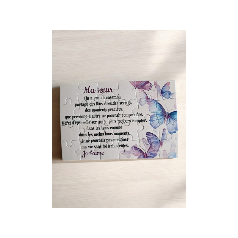 Un cadeau original et tendre pour votre sœur bien-aimée ! Ce puzzle de 24 pièces (16,5 cm x 11 cm) est une manière unique de lui dire combien elle compte pour vous. Avec un joli texte personnalisé, ce puzzle capture des souvenirs, des moments partagés et tout l’amour fraternel. Un clin d'œil parfait pour lui rappeler la place spéciale qu'elle occupe dans votre cœur, et créer un souvenir inoubliable !