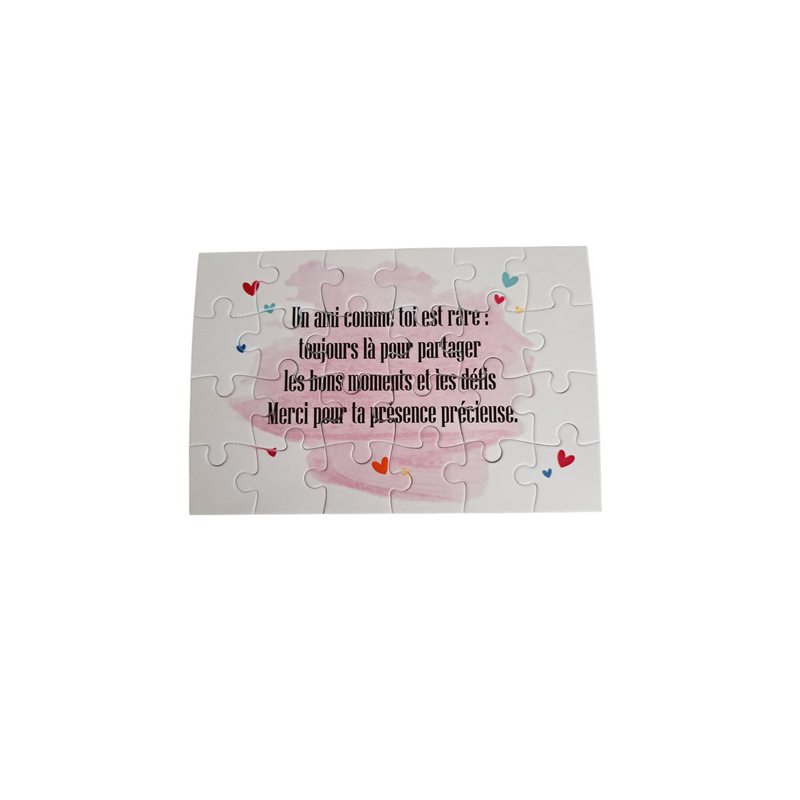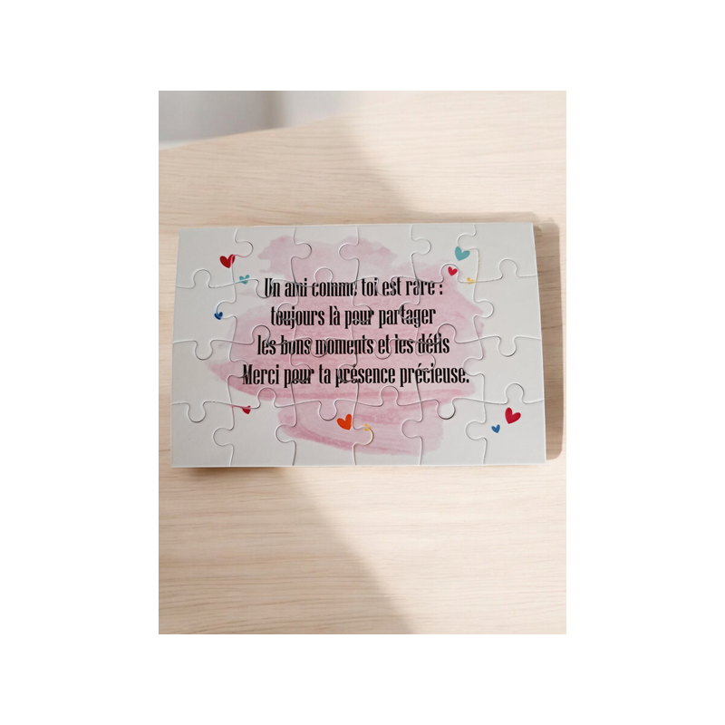 Un cadeau unique pour un(e) ami(e) précieux(se) ! Ce puzzle de 24 pièces (16,5 cm x 11 cm), personnalisé avec un joli texte, est l’attention parfaite pour exprimer votre affection. Un cadeau original et plein de sens, idéal pour partager de beaux souvenirs et renforcer ce lien spécial qui vous unit. Offrez un moment de complicité et de tendresse avec ce puzzle unique, créé spécialement pour votre ami(e)