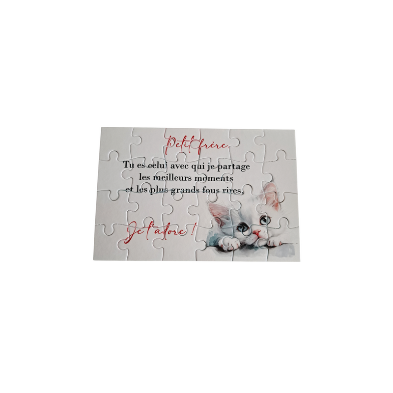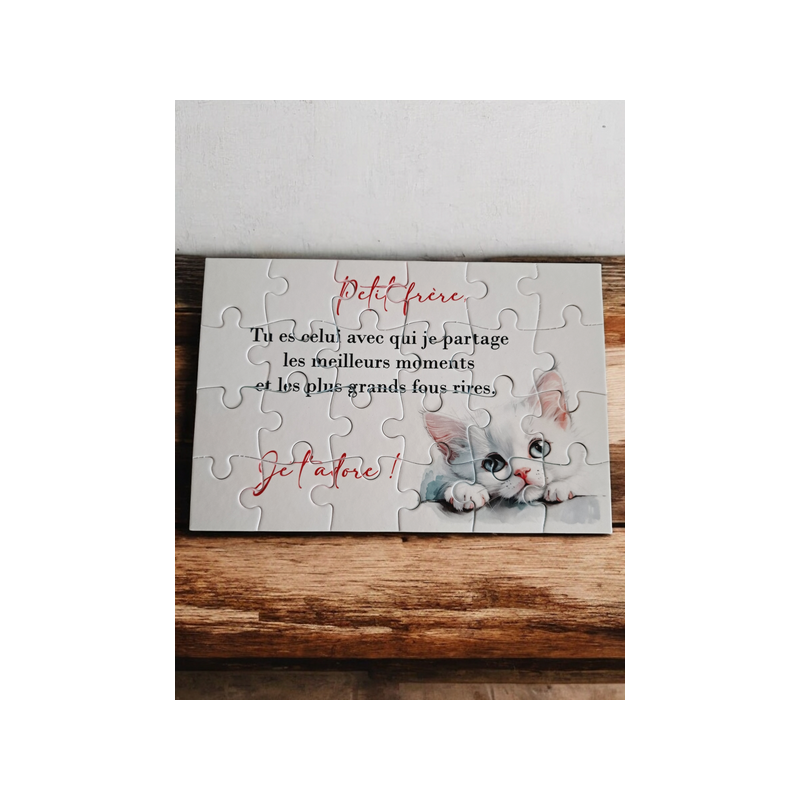 Un cadeau unique pour votre frère ! Ce puzzle de 24 pièces (16,5 cm x 11 cm) avec un joli texte est parfait pour exprimer votre lien fraternel. Ce puzzle personnalisé est bien plus qu’un simple jeu : c’est un souvenir à partager, une manière de lui rappeler les bons moments et tout l’attachement que vous lui portez. Offrez-lui une surprise pleine de sens et de tendresse !