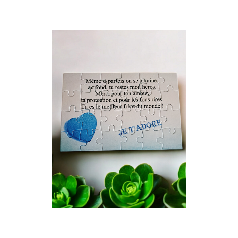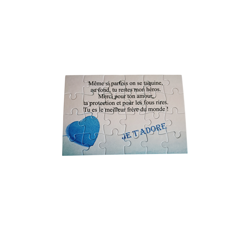 Un cadeau unique pour votre frère ! Ce puzzle de 24 pièces (16,5 cm x 11 cm) avec un joli texte est parfait pour exprimer votre lien fraternel. Ce puzzle personnalisé est bien plus qu’un simple jeu : c’est un souvenir à partager, une manière de lui rappeler les bons moments et tout l’attachement que vous lui portez. Offrez-lui une surprise pleine de sens et de tendresse !