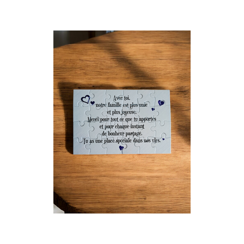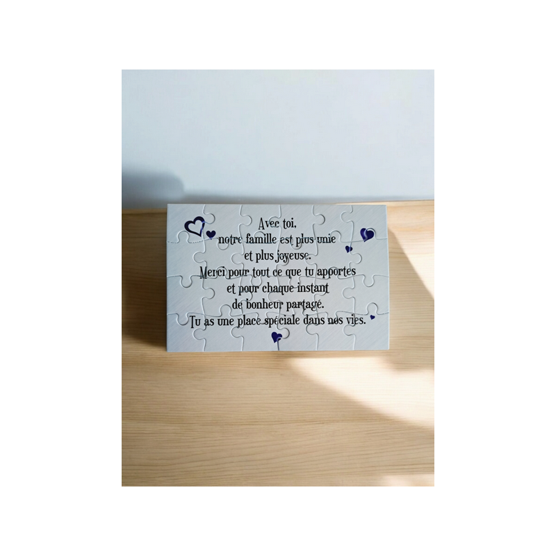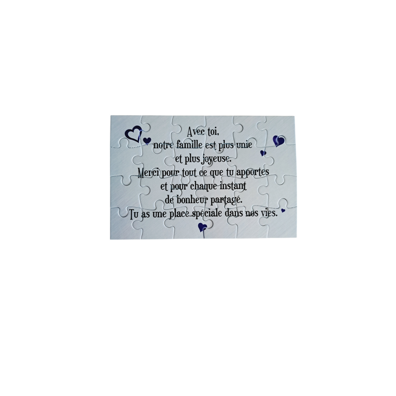 Surprenez votre beau-fils avec un puzzle personnalisé unique ! Avec ses dimensions de 16,5 cm x 11 cm et ses 24 pièces, ce puzzle cache un message chaleureux pour renforcer vos liens et exprimer votre affection. Livré avec un joli sachet/pochon, il est prêt à être offert pour créer un moment de partage inoubliable. Une attention originale qui ne manquera pas de toucher le cœur de votre beau-fils.