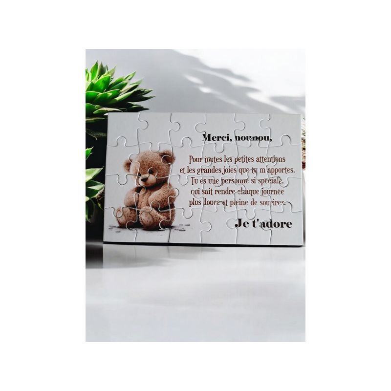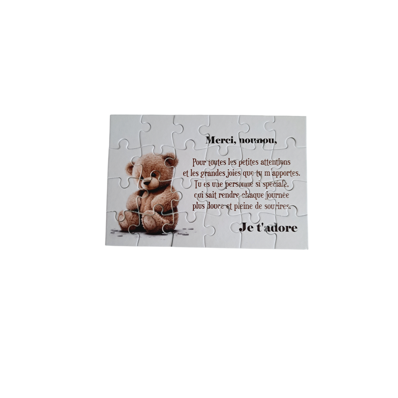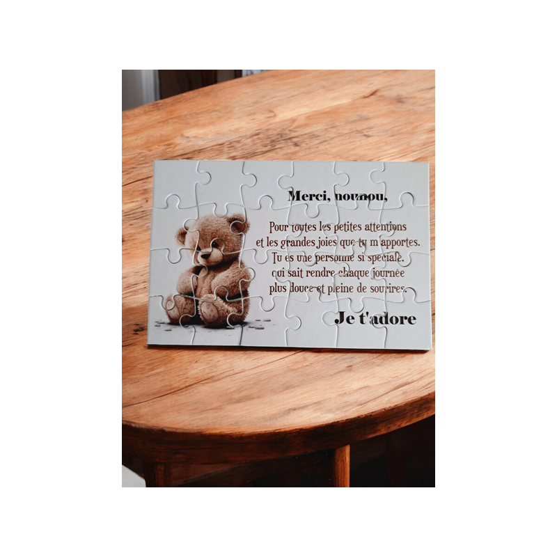 Offrez à votre nounou un puzzle personnalisé unique, qui saura lui montrer toute votre gratitude ! Ce puzzle de 16,5 cm x 11 cm, composé de 24 pièces, révèle un message chaleureux pour lui exprimer combien elle compte pour vous et vos enfants. Livré avec un joli pochon, il est prêt à être offert pour une attention touchante et inoubliable. Un cadeau original pour valoriser son rôle et l’émotion qu’elle apporte au quotidien.
