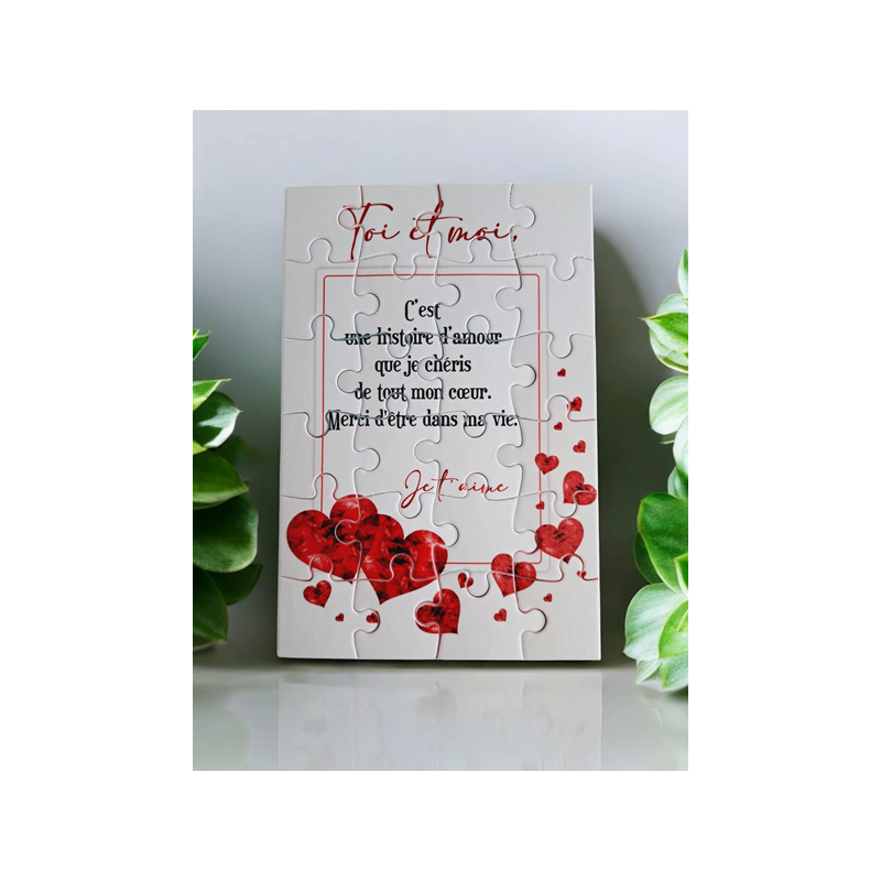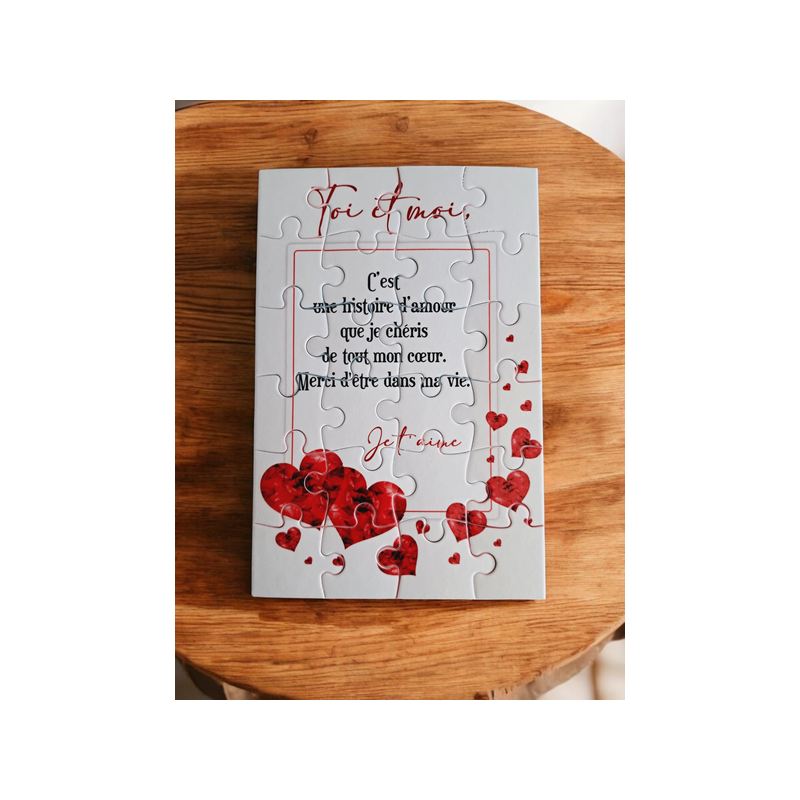 Exprimez vos sentiments avec un puzzle personnalisé unique pour l'être aimé ! Ce puzzle de 16,5 cm x 11 cm, composé de 24 pièces, cache un message d'amour à découvrir pièce par pièce. Livré avec un élégant pochon, il est prêt à être offert pour un moment de tendresse inoubliable. Une attention délicate et originale qui fait battre le cœur."