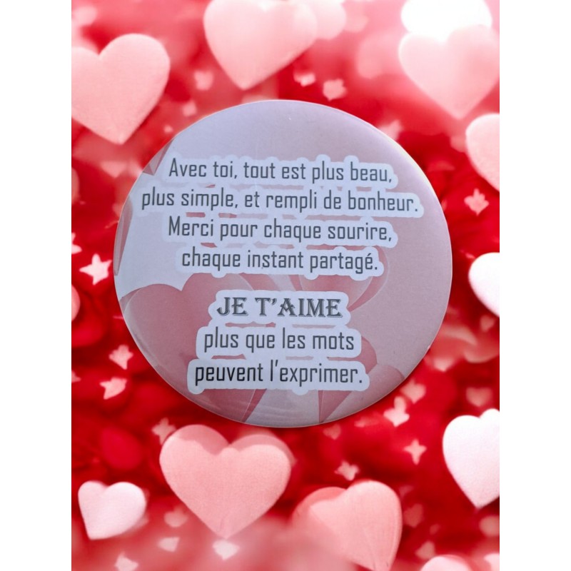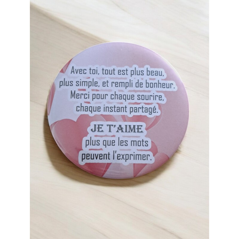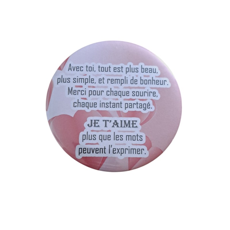 Exprimez votre amour avec cet aimant rond de 7,5 cm de diamètre. Orné d’un message tendre et romantique, il est parfait pour rappeler à votre moitié ou à un être cher combien il/elle compte pour vous. Un petit cadeau symbolique et plein de douceur !