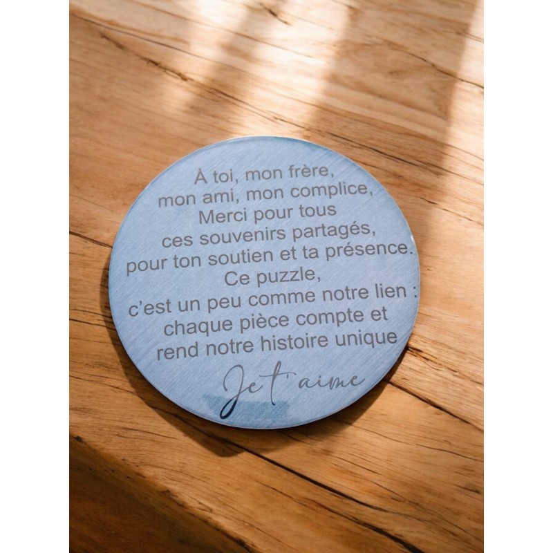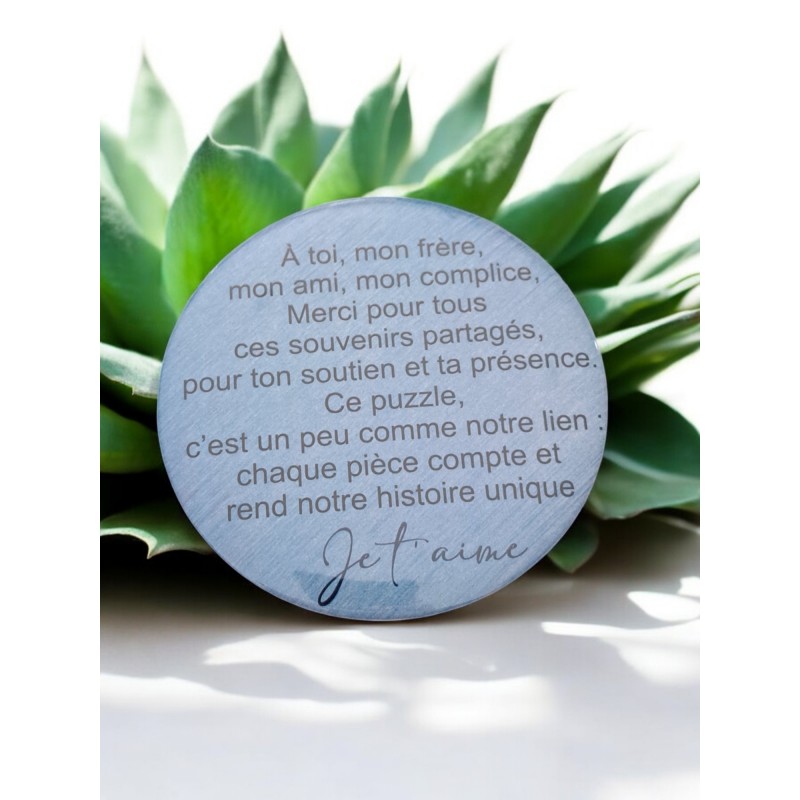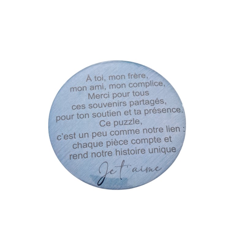 Découvrez cet aimant rond de 7,5 cm de diamètre, parfait pour votre frère ! Avec un joli texte rempli d’amour et de complicité, il sera une belle façon de lui témoigner votre affection. Idéal comme petit cadeau attentionné à offrir pour toute occasion.