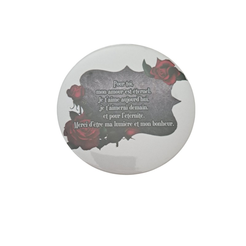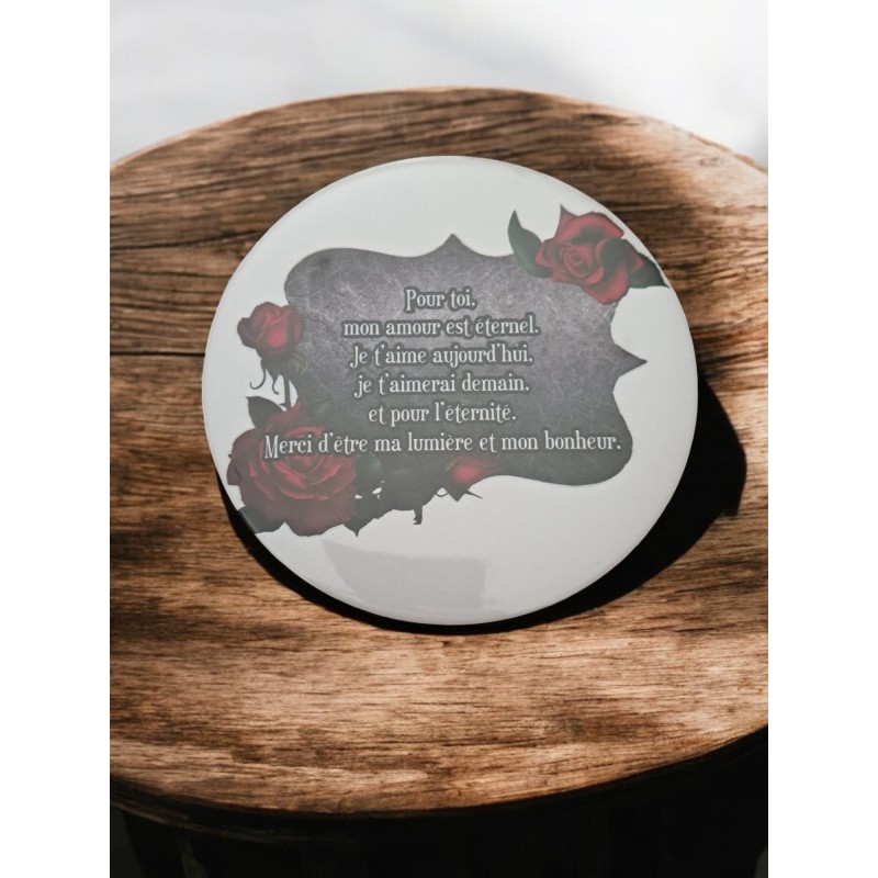 Exprimez votre amour avec cet aimant rond de 7,5 cm de diamètre. Orné d’un message tendre et romantique, il est parfait pour rappeler à votre moitié ou à un être cher combien il/elle compte pour vous. Un petit cadeau symbolique et plein de douceur !