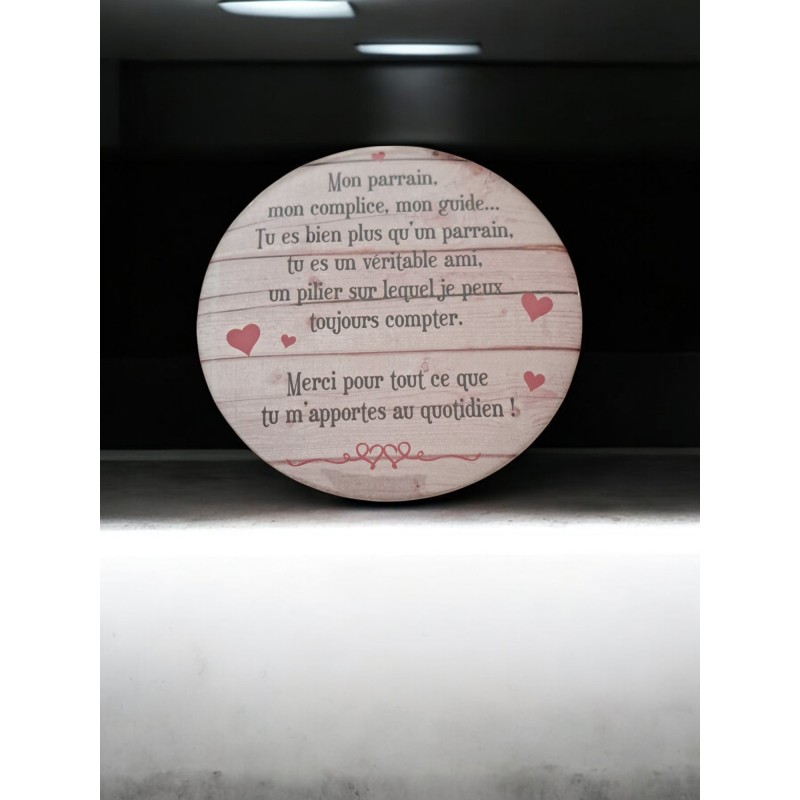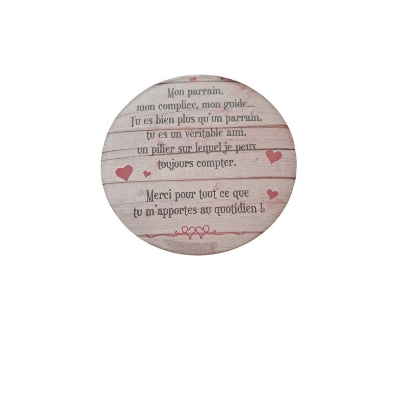 Offrez à votre parrain cet aimant rond de 7,5 cm de diamètre, décoré d’un message touchant et unique. Une belle façon de lui rappeler combien il est important pour vous. Un cadeau symbolique et attentionné, parfait pour toutes les occasions !