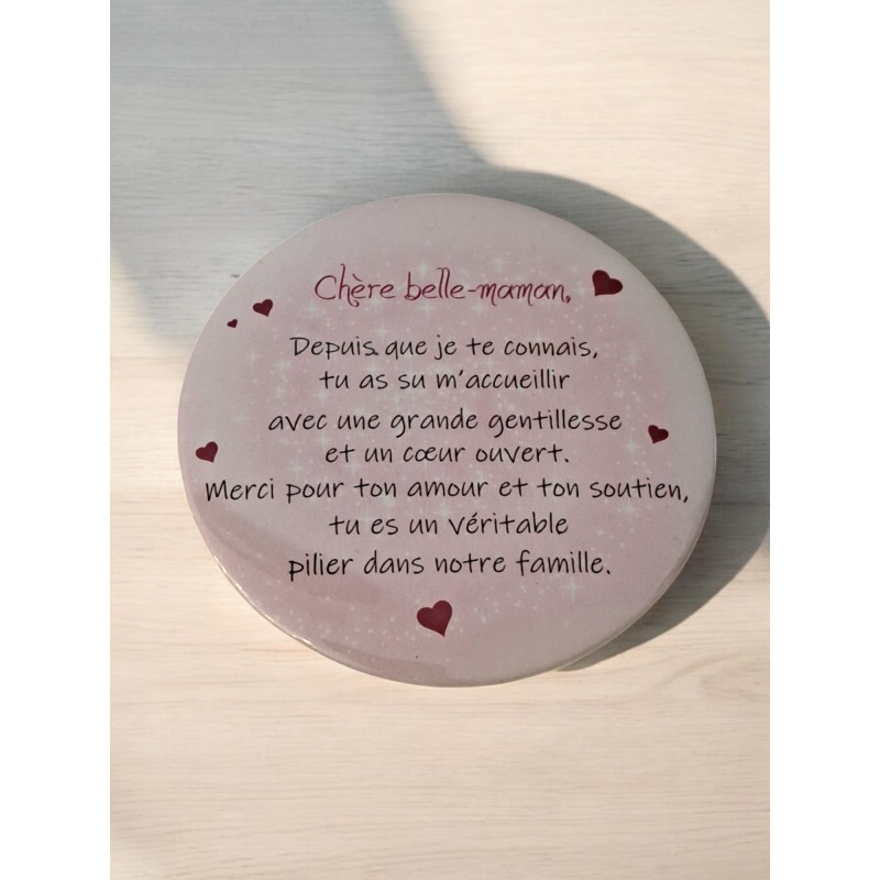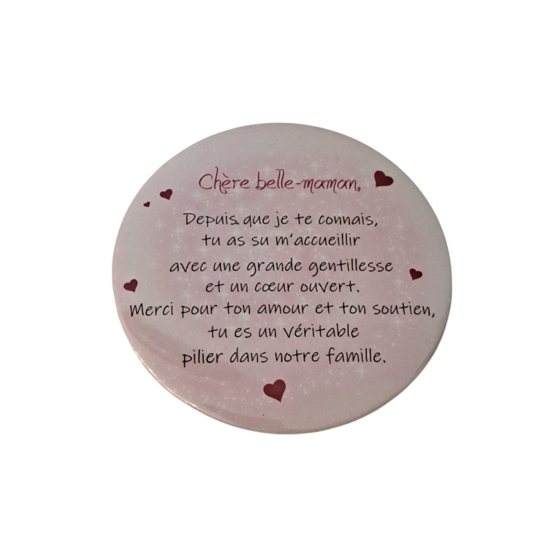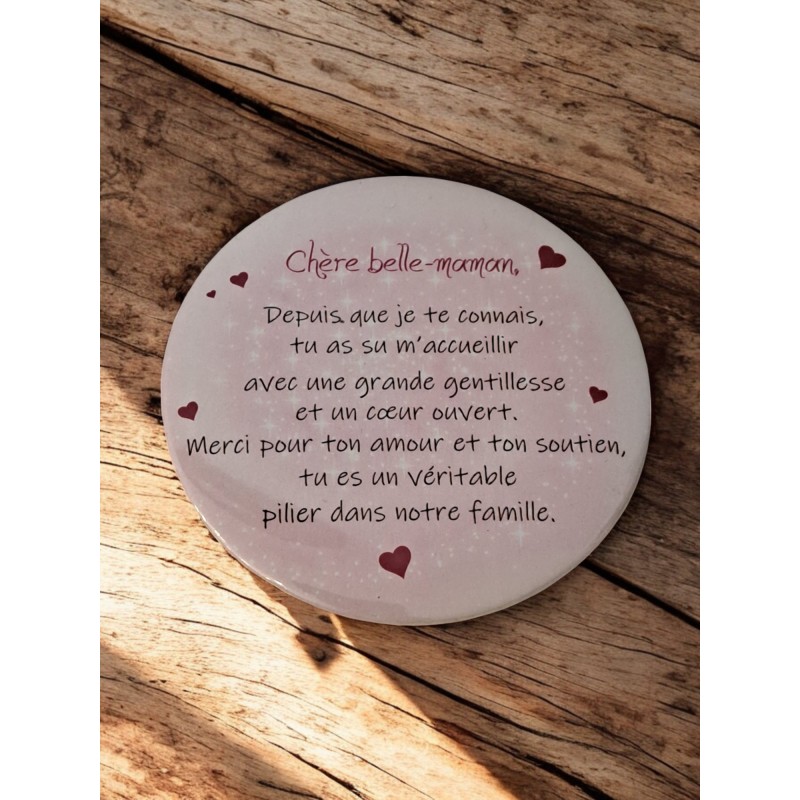 Offrez à votre belle-mère cet aimant rond de 7,5 cm de diamètre, décoré d’un message plein de tendresse et de reconnaissance. Une belle façon de lui montrer qu’elle occupe une place importante dans votre vie. Un cadeau attentionné et unique !