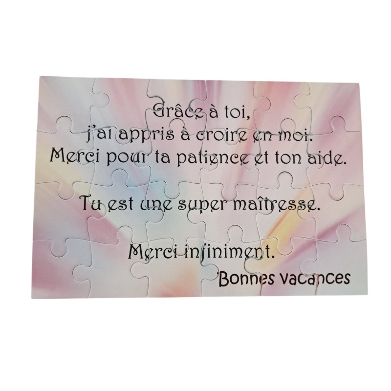 Composé de 24 pièces et mesurant 16,5 cm x 11 cm, ce puzzle dévoile un petit texte plein de tendresse pour lui dire merci pour son accompagnement, sa patience et son dévouement tout au long de l’année.