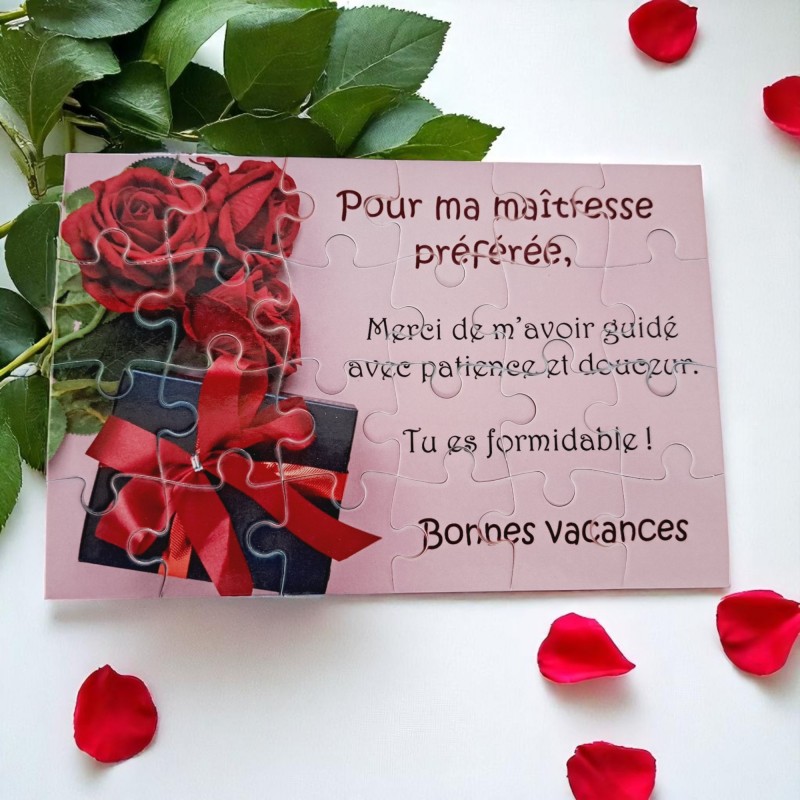 Composé de 24 pièces et mesurant 16,5 cm x 11 cm, ce puzzle dévoile un petit texte plein de tendresse pour lui dire merci pour son accompagnement, sa patience et son dévouement tout au long de l’année.