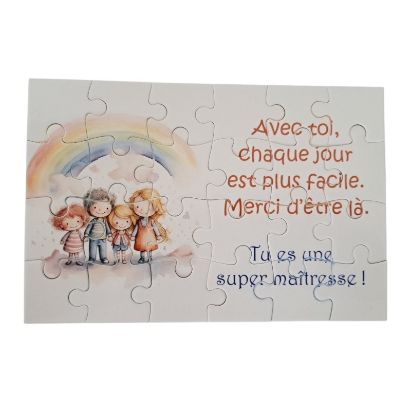 Composé de 24 pièces et mesurant 16,5 cm x 11 cm, ce puzzle dévoile un petit texte plein de tendresse pour lui dire merci pour son accompagnement, sa patience et son dévouement tout au long de l’année.
