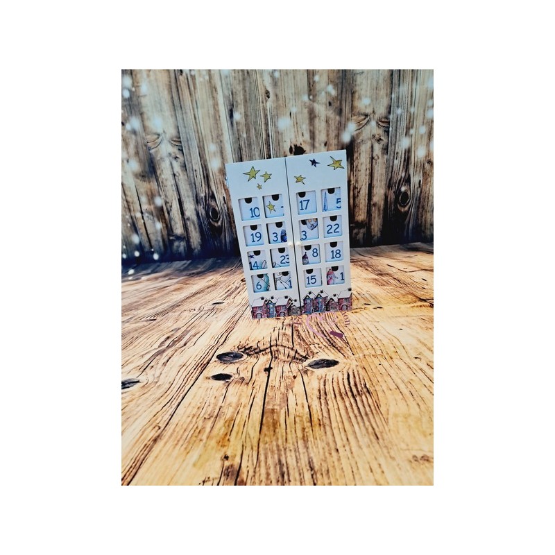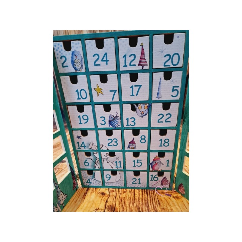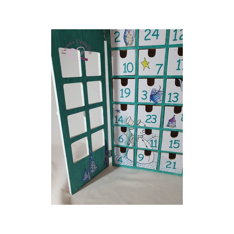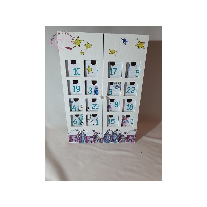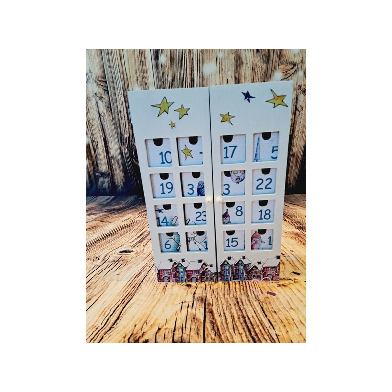 Ce calendrier en bois est joliment décoré. Il contient 24 tiroirs à ouvrir dans lesquels vous pouvez déposer friandises ou autres surprise.