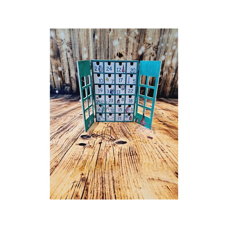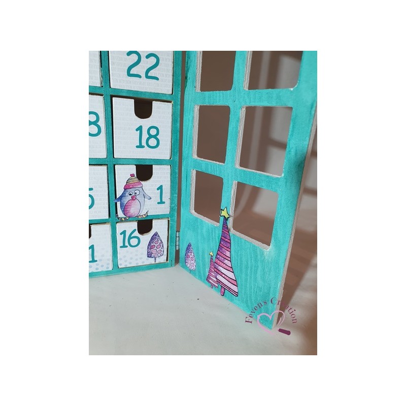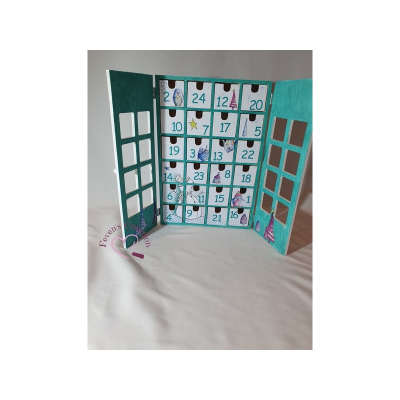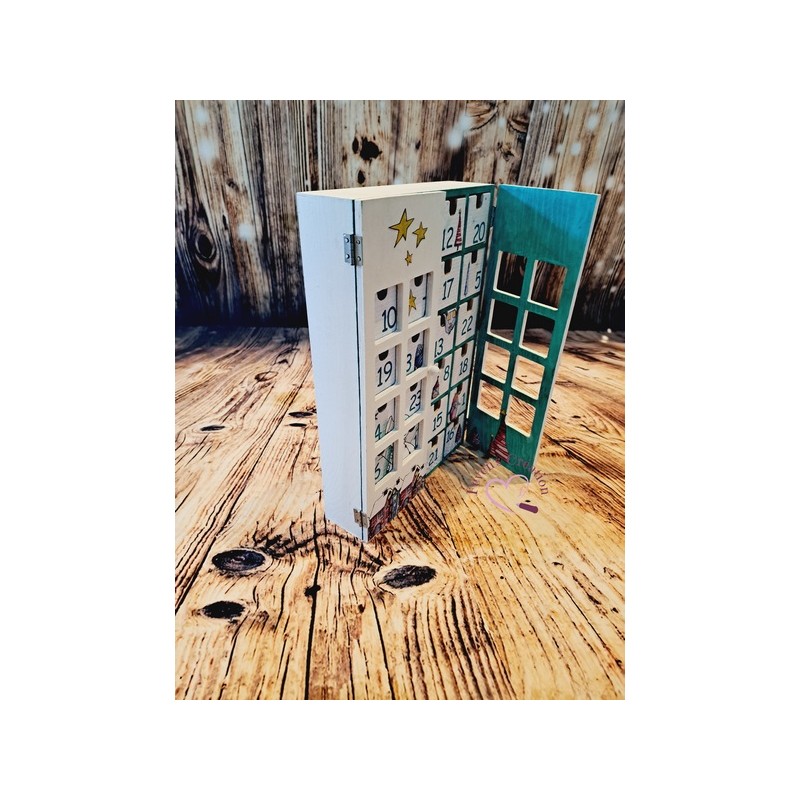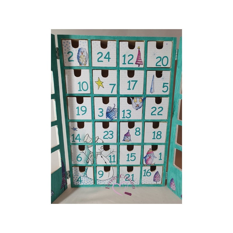 Ce calendrier en bois est joliment décoré. Il contient 24 tiroirs à ouvrir dans lesquels vous pouvez déposer friandises ou autres surprise.