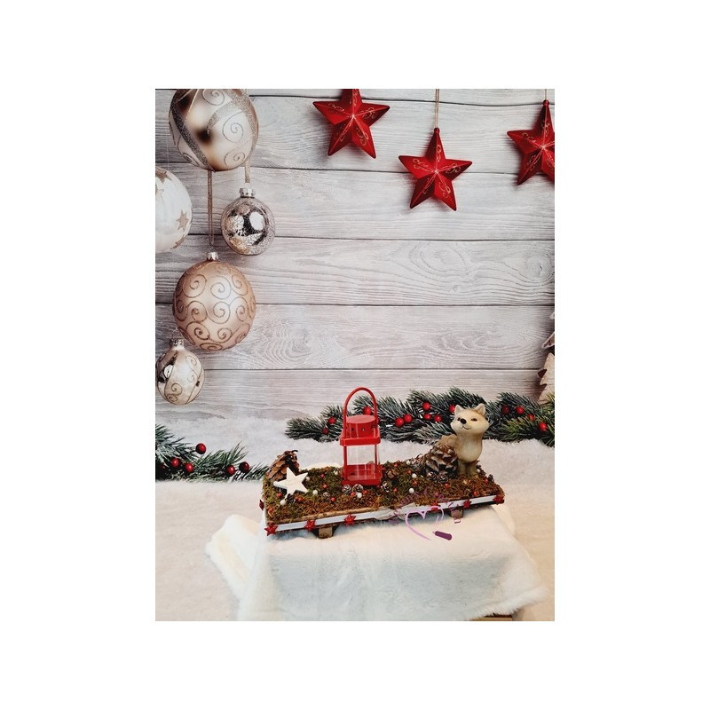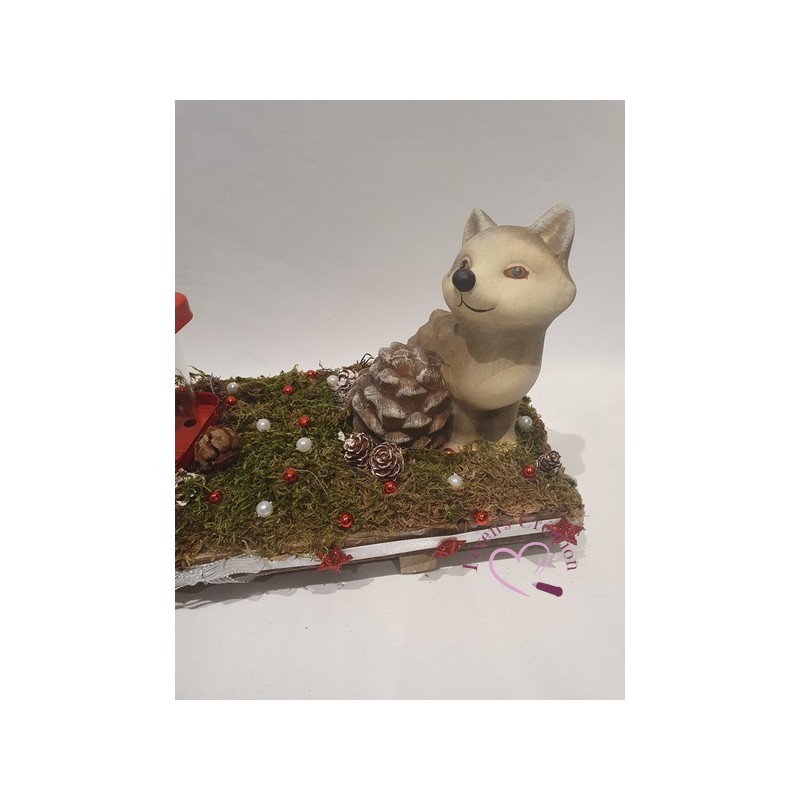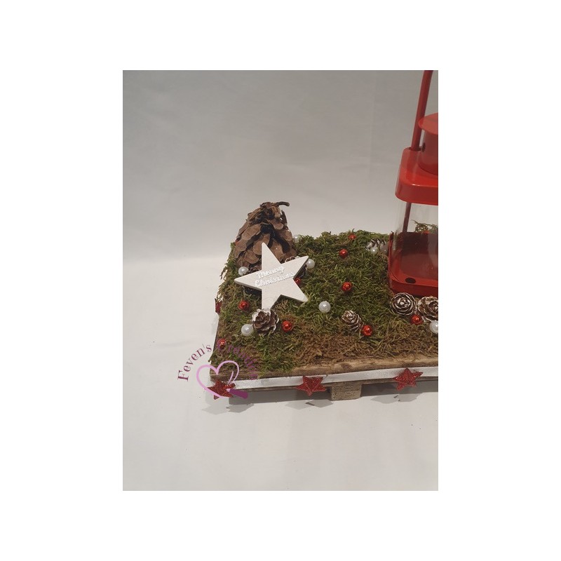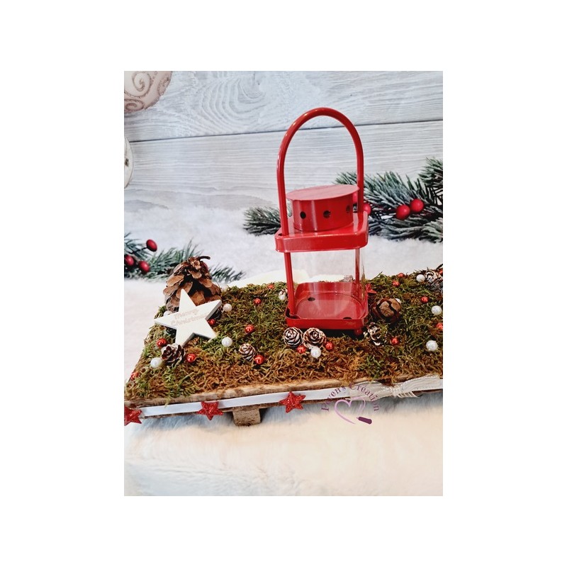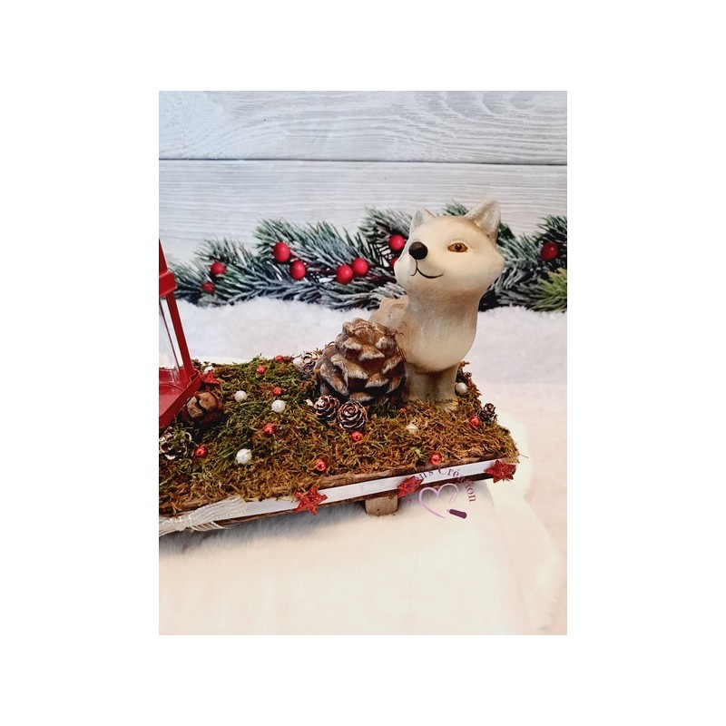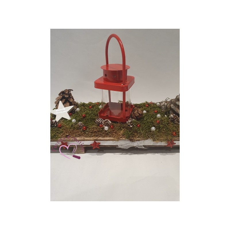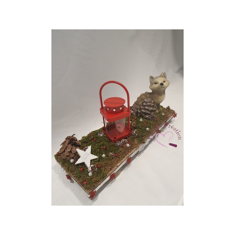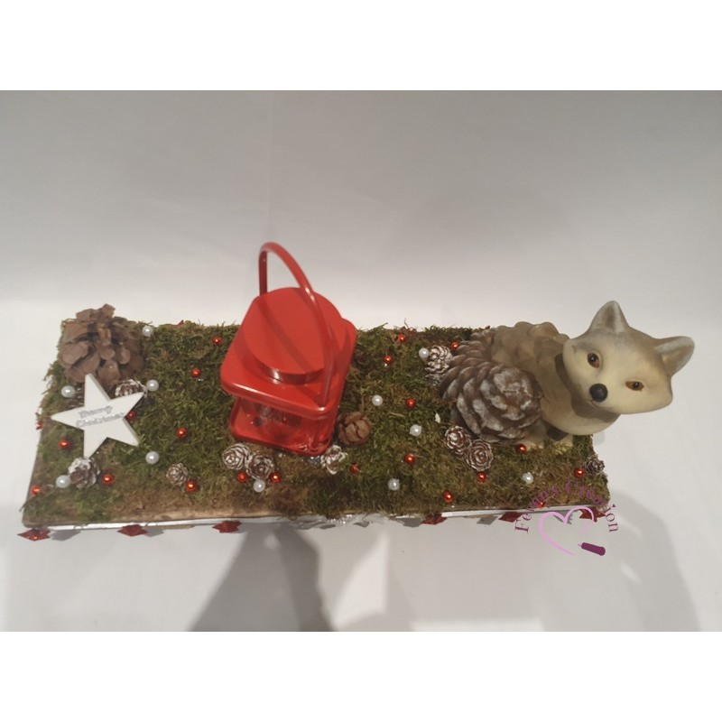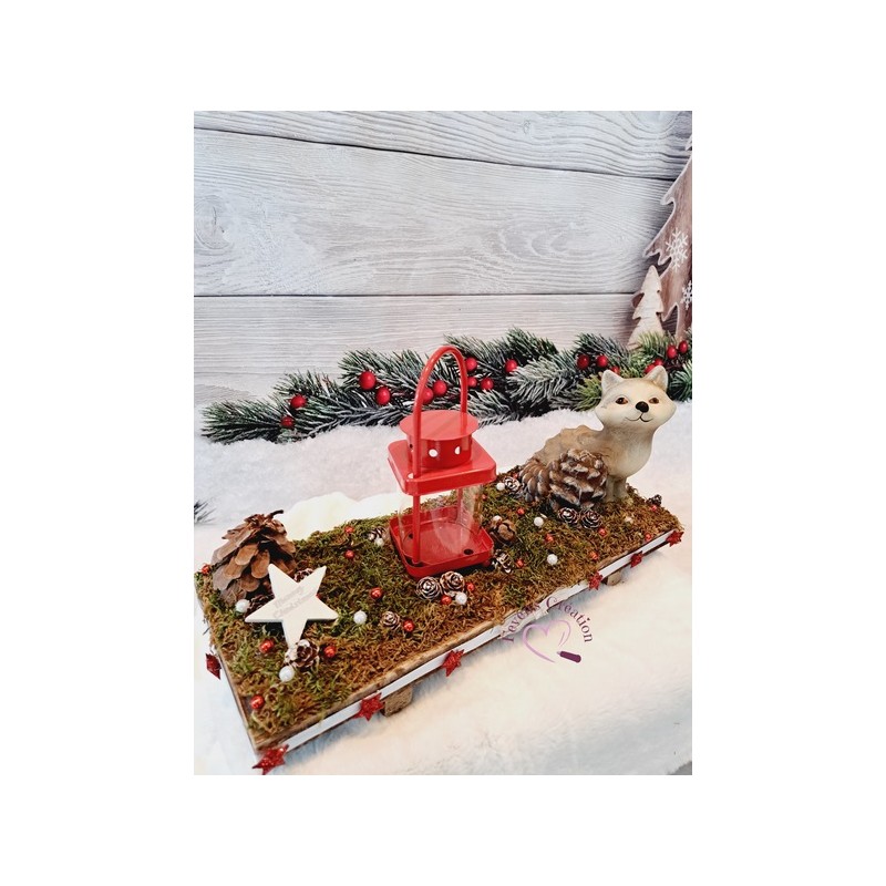 Harmonieusement décoré de bois, de pommes de pin et autres petites décorations, il trouvera sa place au centre de votre table ou en décoration sur un meuble. Il est également composé d'une bougie.