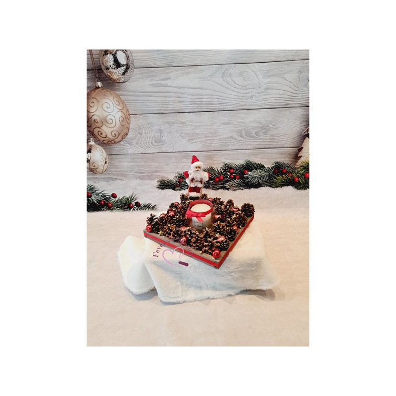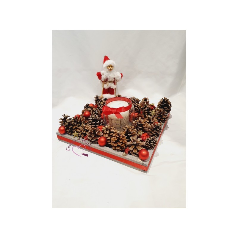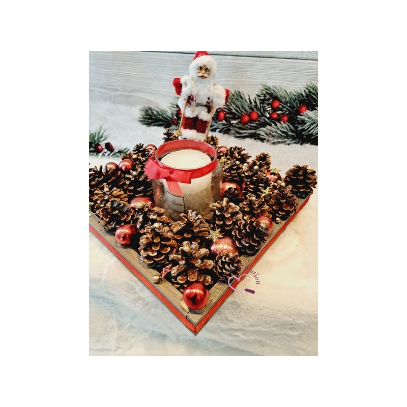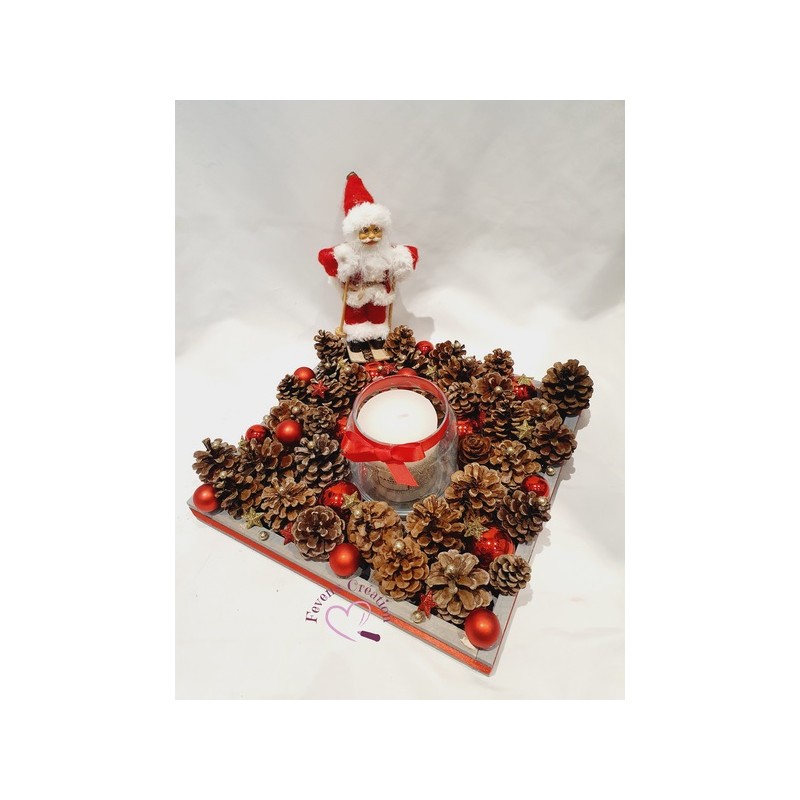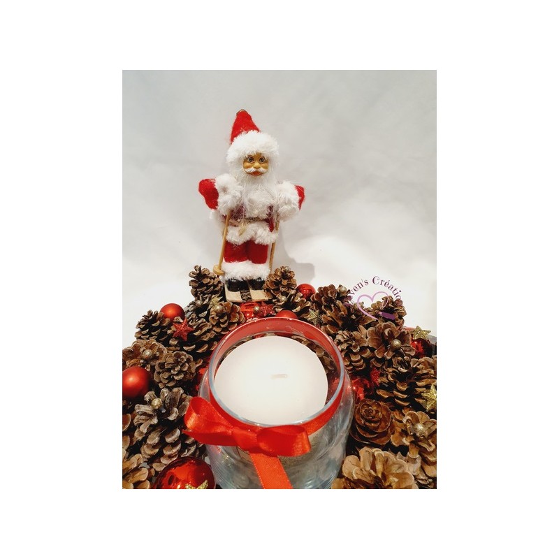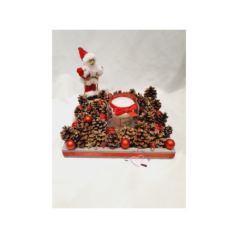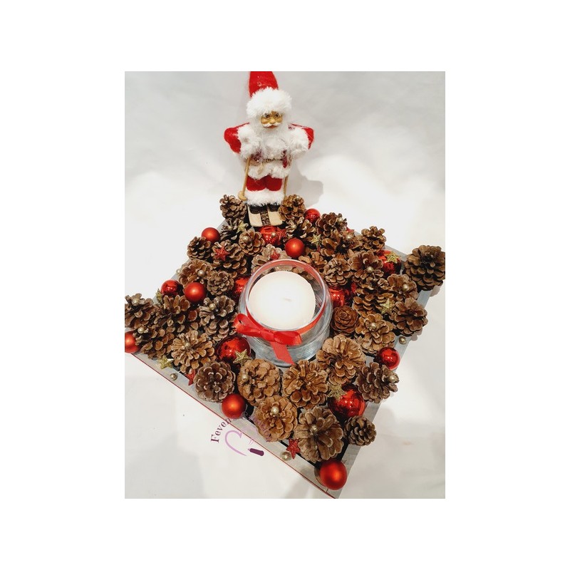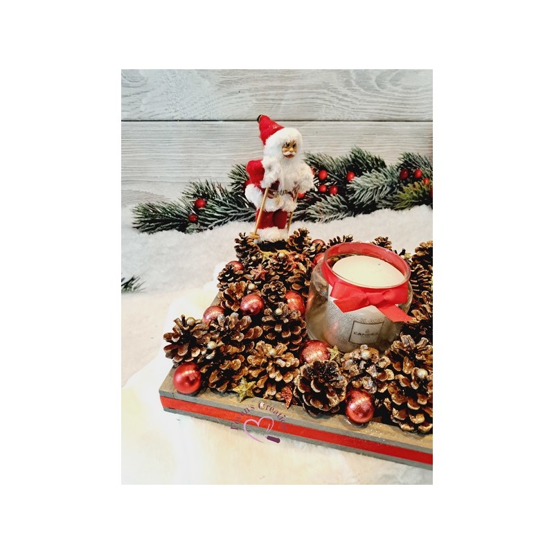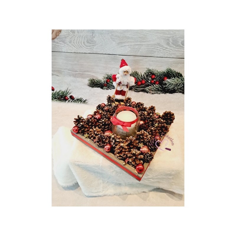 Harmonieusement décoré par des pommes de pin, boules et autres petites décorations, il trouvera sa place au centre de votre table ou en décoration sur un meuble. Il est également composé d'un bougeoir (vendu avec une bougie).