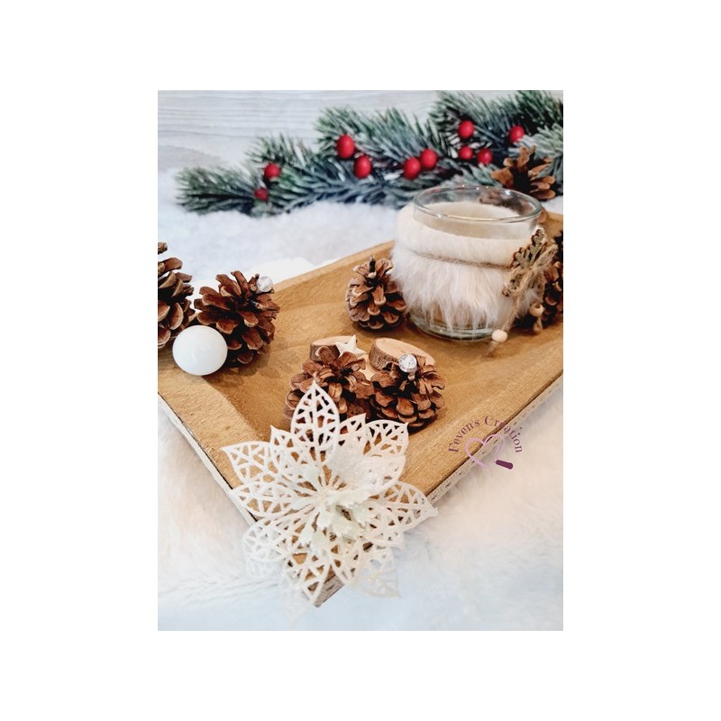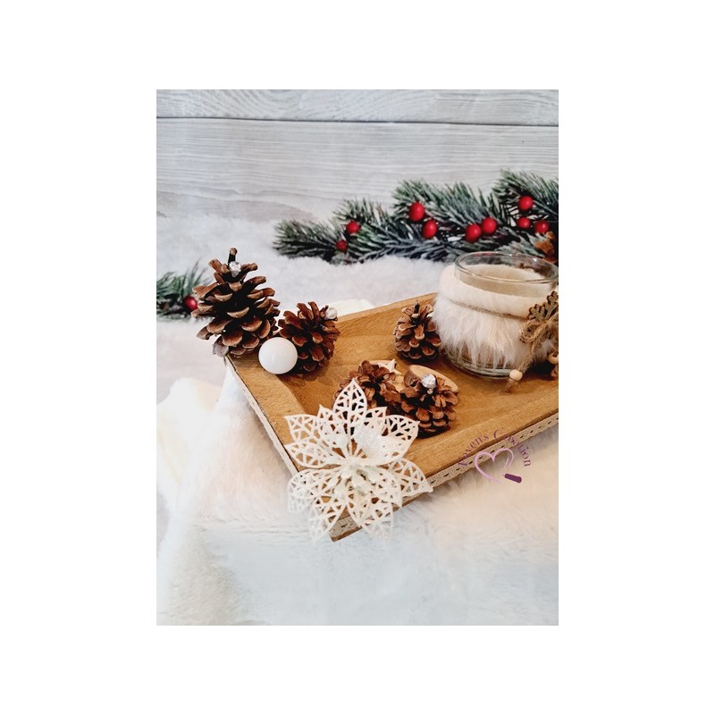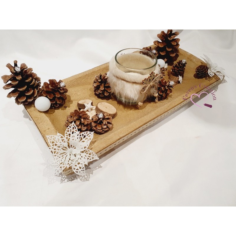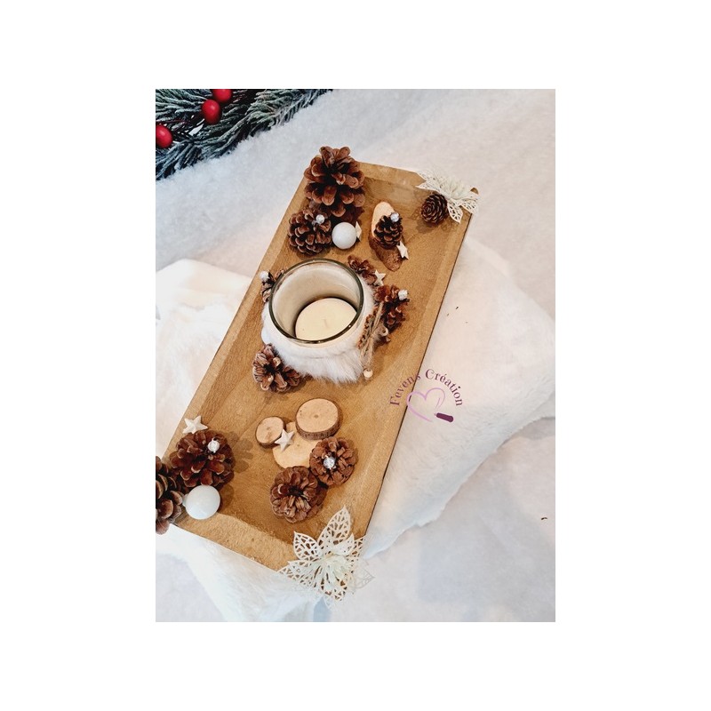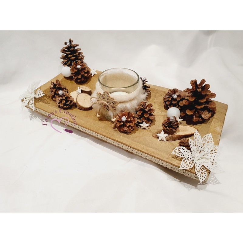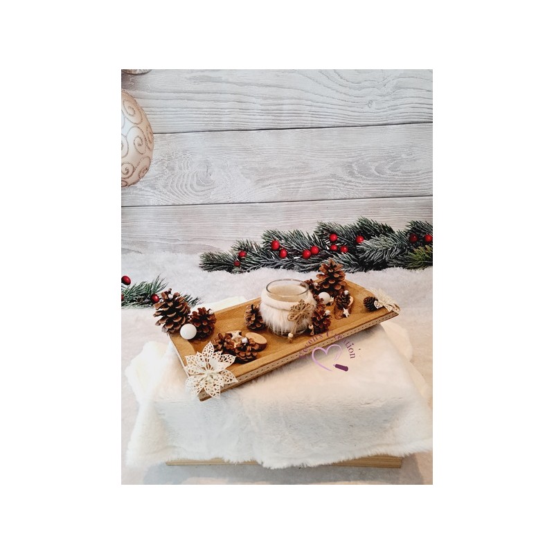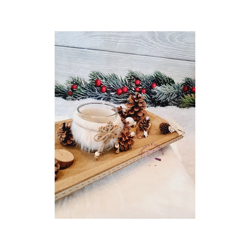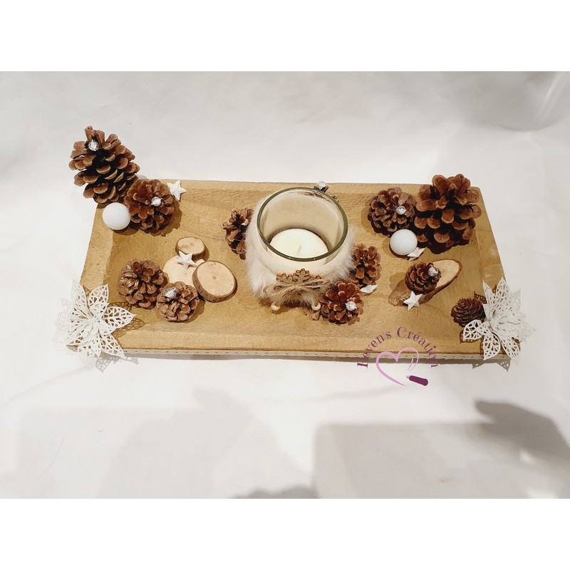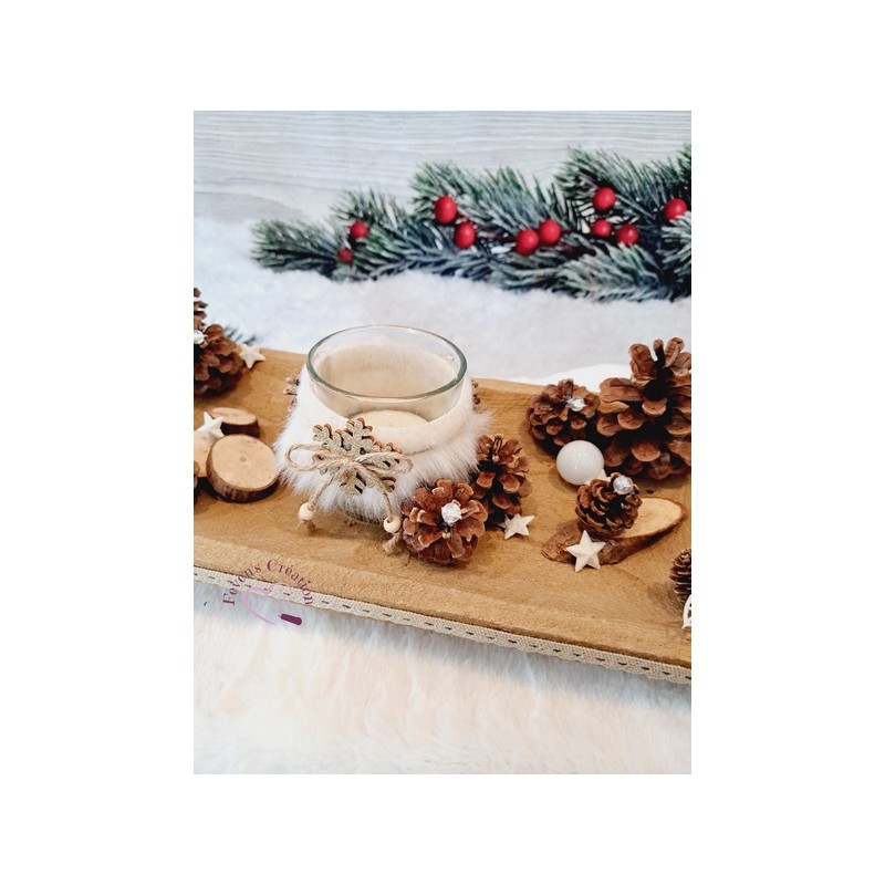 Harmonieusement décoré par des pommes de pin, boules et autres petites décorations, il trouvera sa place au centre de votre table ou en décoration sur un meuble. Il est également composé d'un bougeoir (vendu avec une bougie chauffe-plat).