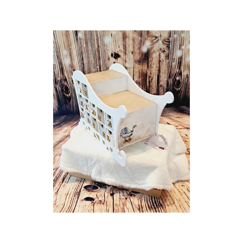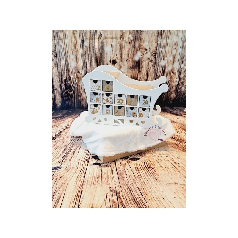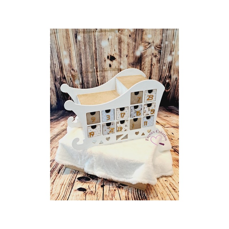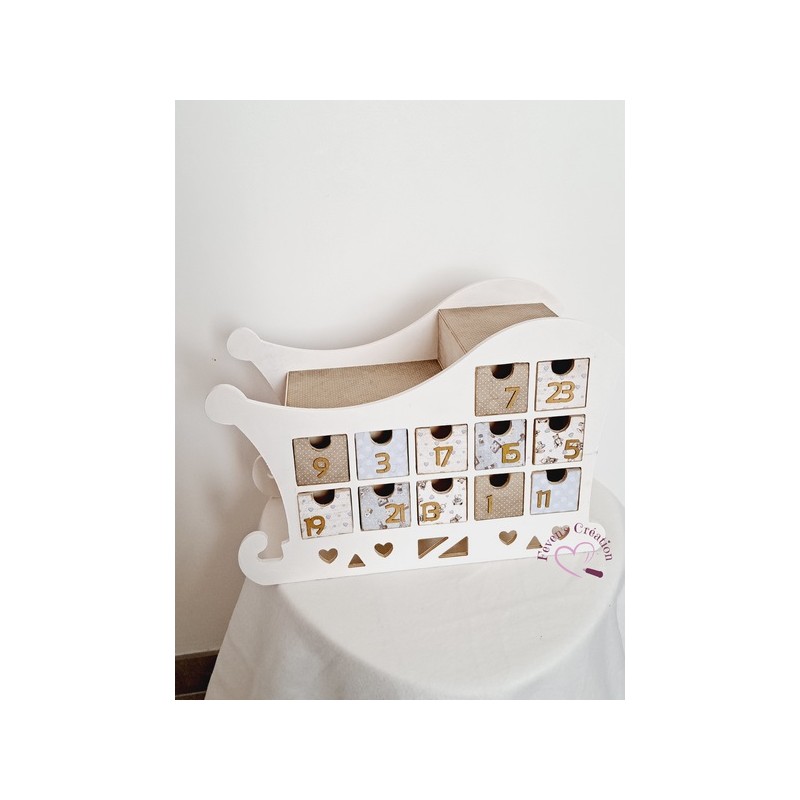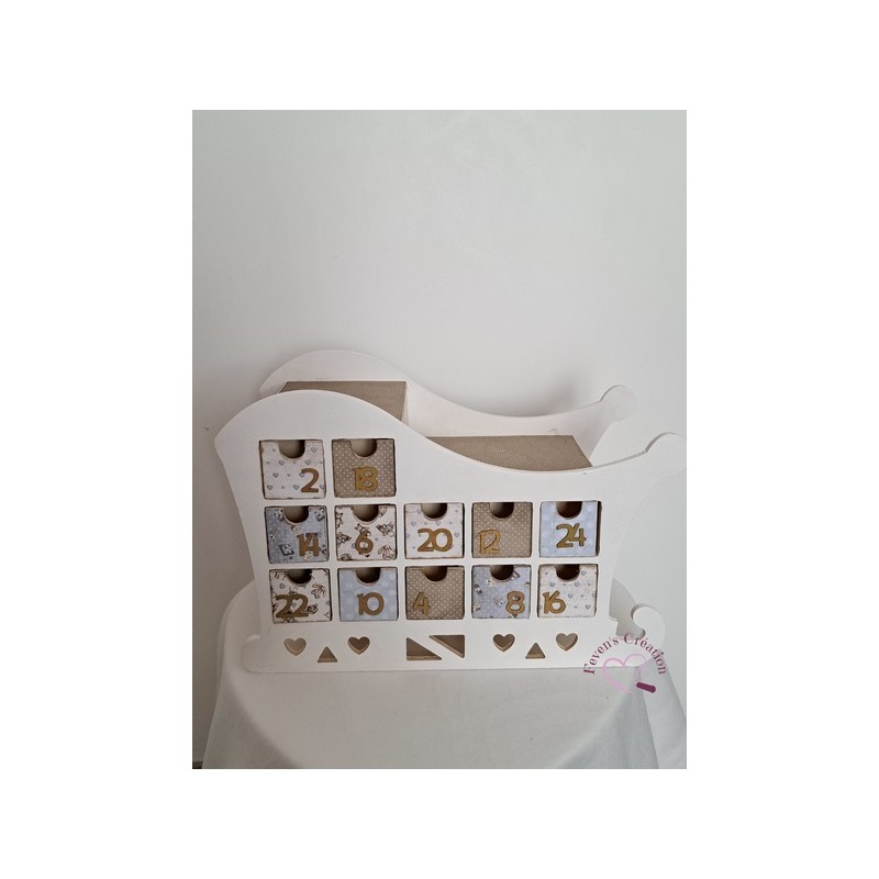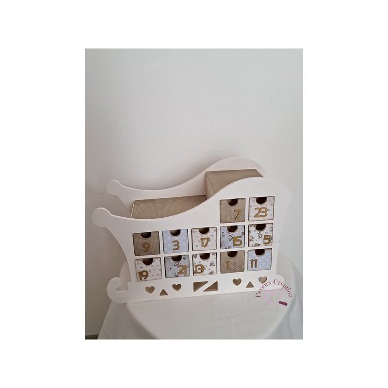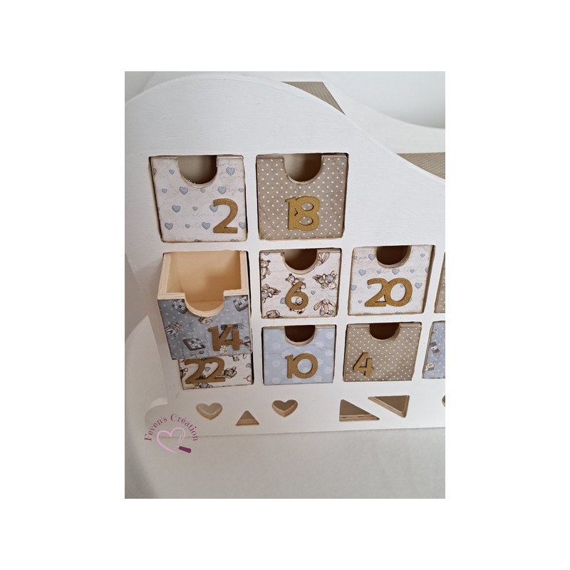 Ce calendrier en bois est joliment décoré. Il contient 24 tiroirs à ouvrir dans lesquels vous pouvez déposer friandises ou autres surprise.