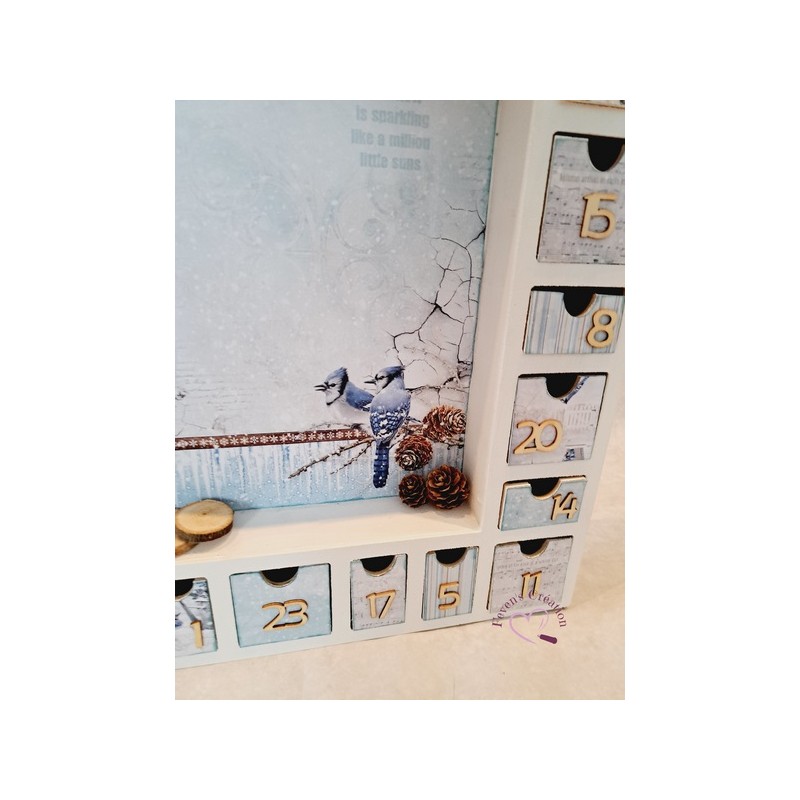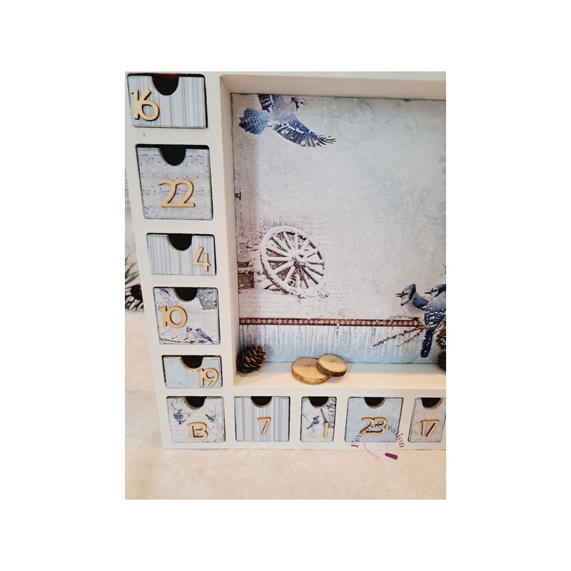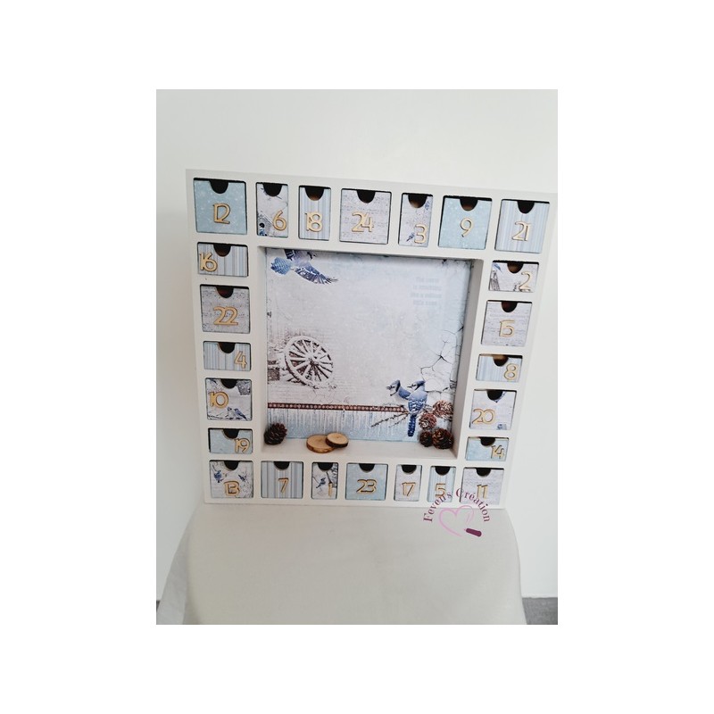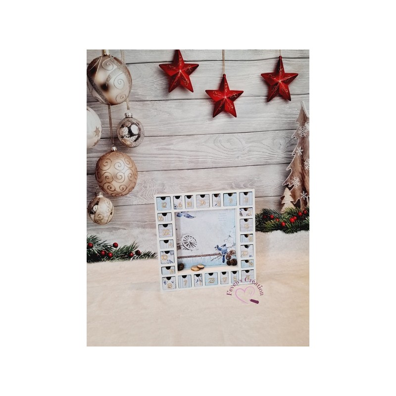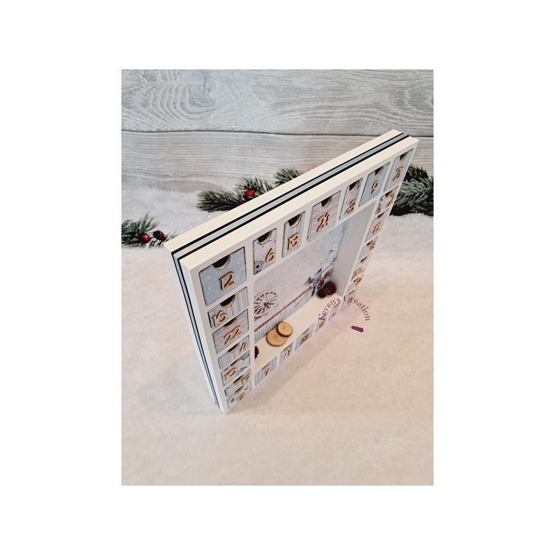 Ce calendrier en bois est joliment décoré Il contient 24 tiroirs à ouvrir dans lesquels vous pouvez déposer friandises ou autres surprise.