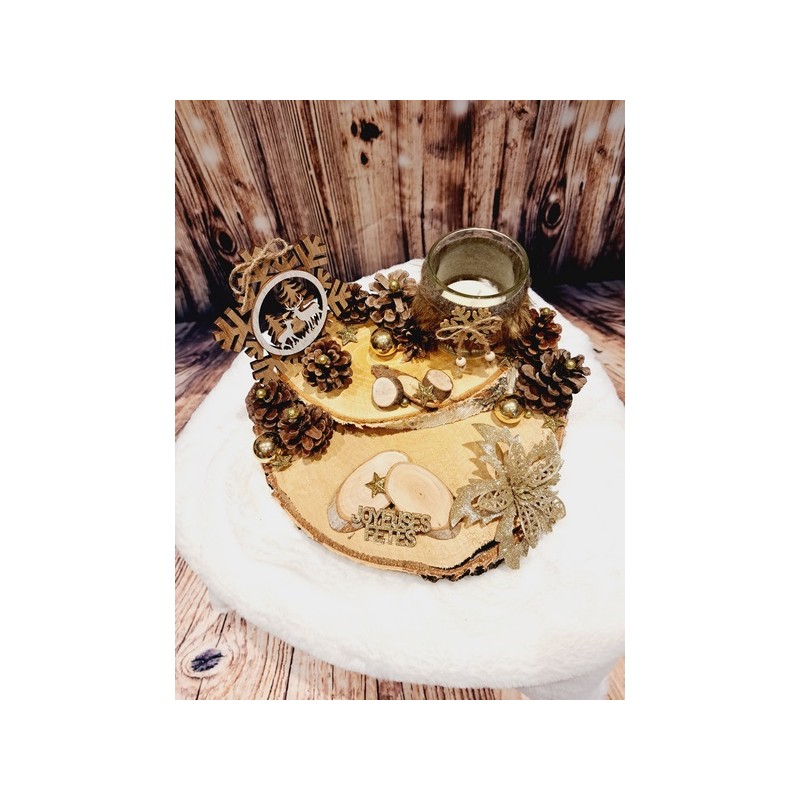 Harmonieusement décoré par des pommes de pin, boules et autres petites décorations, il trouvera sa place au centre de votre table ou en décoration sur un meuble. Il est également composé d'un bougeoir (vendu avec une bougie).